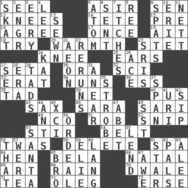 ACROSS 1. Sew up the eyelids of hawks and falcons 5. SW Saudi Arabia district 9. Elected rep. 12. Leg joints 14. Wig 15. Before (prefix) 16. Match 17. At one time in the past 18. Small island 19. Attempt 20. Heat 23. Proofreading order 24. Leg joint 25. Hearing organs 27. Stalk of a moss capsule 30. Mouth or opening 32. _-fi 33. Part of Q.E.F. 34. Religious women 36. Double-curved letter 38. Small amount or degree 39. Fish or hair follower 40. Tenth month of the Hindu calendar 43. Saxophone 46. "Two Mules for Sister ____" 48. Indian skirt 49. Non-commissioned officer (abbr.) 51. Director Reiner 52. Clip 53. Tumult 54. Waist strap 56. It was, poetically 58. Keyboard key 61. Health resort 64. Layer 65. Actor Lugosi 66. Relating to or accompanying birth 68. Nonscientific branch of learning 69. Precipitation 70. A sleeping potion; an opiate (poet.) 71. Afternoon social gathering 72. Cassini of fashion 73. Celtic language DOWN 1. Three-handed card game 2. Engineer (abbr.) 3. Suggestive of the supernatural 4. Area sheltered from the wind 5. Smallest unit of an element 6. Emitted 7. Irritating cutaneous sensations 8. To sift 9. Arguments over trivial matters 10. 4th largest of the Great Lakes 11. Remaining after all deductions 13. Stitched 21. Period of immesurable duration 22. Summer TV shows 23. Indian titles of respect 24. Krazy ___ of comics 26. Adept person 27. Arrange properly for use 28. Epoch 29. Small boys 31. Approach 35. Disco prop 37. Connect, as a bridge 41. RI univ. 42. Small drink 44. Pismires 45. One more than ninety 47. Collude with 48. Fast jet (abbr.) 50. Severe or trying experience 53. Before Barbara or Clara 55. Grant temporary use of 56. Not this but _ 57. We are 59. Writer Wiesel 60. Austrian-born American filmmaker Fritz 61. Play the lead 62. Friends 63. Toward shelter 65. Sis' sibling 67. Deep reverence