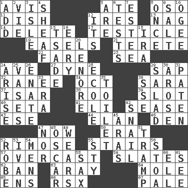ACROSS 1. Advice 5. Had dinner 8. Bear (Spanish) 11. Food container 12. Angers 13. Tired old horse 14. Erase 17. A testis 19. Artist's stands 21. Cylindrical with tapered ends 22. Conductor's collection 23. Ocean 24. "___ Maria" 27. Unit of force 29. Plant excrement 32. The wife of a rajah (variant) 34. Sep. follower 36. "Two Mules for Sister ____" 37. Austrian river, tributary to the Danube 38. Friend of Pooh 39. Position in a hierarchy or organization 40. Stalk of a moss capsule 41. Connecticut Ivy Leaguer 42. Gospel singer Marvin 43. Compass dir. 44. Enthusiasm 46. Lair 47. At this time 50. Part of Q.E.F. 52. Full of chinks, cracks, or crevices 55. Flight of steps 57. Cloudy 59. Chalkboards 62. Bar 63. Like ___ of sunshine 64. Undercover agent 65. Followers of ems 66. Acura sports coupe 67. Light colored DOWN 1. Find the sum of 2. Compete 3. Capri or Wight 4. To gather and bind into a bundle 5. "We ___ not amused" (Victoria) 6. Trials 7. First name in cosmetics 8. At one time in the past 9. Table seasoning 10. Double curve, resembling the letter S 12. ___ a Wonderful Life 15. Sadhe (variant) 16. Suggestive of the supernatural 18. Lyricist Gershwin 20. Poe poem 24. Originate 25. Flower holders 26. Related on the mother's side 28. Learning spot: Fr. 29. First course 30. Came up 31. Eucharist need 33. Epoch 35. Bathroom plumbing fixture 36. Compass dir. 42. Slow-paced one 45. Caspian sea tributary 47. Or not 48. Motion picture award 49. Erodes 51. _____ steamer (cargo ship) 52. Loose flowing garment 53. _ the terrible 54. Not women's 55. Filthy place 56. Portico 58. Saxophone 60. Pipe bend 61. Perceive with the eye