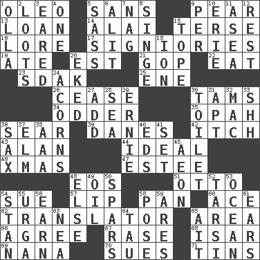 ACROSS 1. Butter sub 5. Without 9. Lightbulb-shaped fruit 13. Grant temporary use of 14. Jai ____ 15. Laconic 16. Old wives' tales, e.g. 17. Seigniories (variant) 19. Had dinner 20. Eastern Standard Time (abbr.) 21. Grand Old Party 22. Erode 23. Neighbor of Neb. 25. Compass dir. 26. Desist 30. Scottish caps 34. More peculiar 35. Brightly colored fish 36. Wither 39. Natives or inhabitants of Denmark 42. Hankering 43. ____ Jay Lerner 44. Standard of perfection 46. Dec. holiday 47. First name in cosmetics 48. Greek goddess of the dawn 51. "Beetle Bailey" pooch 54. Institute legal proceedings 57. Mouth edge 58. Baking dish 60. Adept person 62. Interpreter 65. Length times width 66. Match 67. Raze (variant) 68. Austrian river, tributary to the Danube 69. Grandmother 70. Institutes legal proceedings 71. Airtight sealed metal containers DOWN 1. Rounded earthenware pot or jar 2. Plunders 3. Having ears or earlike features 4. Single 5. Backtalk 6. Came down and settled, as after flight 7. Tired old horse 8. Scorch 9. For each 10. 4th largest of the Great Lakes 11. Toward the sea 12. State of inaction 15. Drink excessively 18. Electrically charged atom 20. Made supply last 24. Oak nuts 27. Find the sum of 28. Ocean 29. Bert's buddy 30. Bathroom plumbing fixture 31. Fitting 32. Apple computer (short form) 33. Quiet! 36. Saxophone 37. Shade tree 38. Auto club (abbr.) 40. Begley and Asner 41. Arrange properly for use 45. Age 48. Otherwise 49. Lubricate 50. Practice fights 52. Tarsus (plural) 53. Sea 54. Comedian Laurel of Laurel & Hardy 55. Capital and largest city of Mongolia 56. Merit 58. Introduce or present, as a question 59. Ancient Greek god of war 61. Hearing organs 63. Teachers' org. 64. The 19th letter of the Greek alphabet 65. Small island