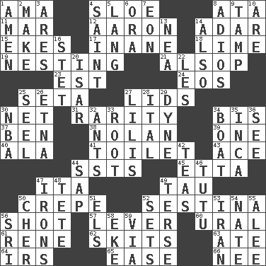 ACROSS 1. Wet nurse (var.) 4. A type of plum 8. _ moment's notice (2 wds.) 11. Impair 12. Composer Copland 14. The sixth month of the Jewish calendar 15. Supplements with great effort 17. Lacking in sense or substance 18. Welles in "The Third Man" 19. Inhabiting a nest 21. Columnist Joseph or Stewart 23. Eastern Standard Time (abbr.) 24. Greek goddess of the dawn 25. Bristle 27. Hats (slang) 30. Fish or hair follower 31. Noteworthy scarcity 34. Altar cloth linen 37. Benjamin's nick name 38. Pitcher Ryan 39. Single 40. In the manner of 41. Bathroom 43. Adept person 44. Fast planes 45. Singer James 47. Call ___ day 49. The 19th letter of the Greek alphabet 50. Streamer paper 52. French poetic form 56. Went for two points 57. Crowbar 60. Mountain range 61. French philosopher Descartes 62. Burlesque acts 63. Had dinner 64. Big collection agency 65. Relaxation 66. Born DOWN 1. So be it 2. Cause to be 3. Ancient Greek god of war 4. Virtuous person 5. Long (Scottish) 6. Mouth or opening 7. A really long time 8. Goodbye (Sp.) 9. Pack (down) 10. "We ___ not amused" (Victoria) 13. Teachers' org. 14. In addition 16. Proofreading order 20. Austrian river, tributary to the Danube 22. French article 25. Stitch closed the eyes of (a falcon) 26. Inactive volcano in Sicily 27. Ms. Damita and namesakes 28. Slanted text style (abbr.) 29. Unit of force 30. Basketball assoc. 32. Pismires 33. Carrot, for example 34. Water vessel 35. South American Indian 36. Perceive with the eye 42. Beverages made from leaves 44. Plant excrement 46. Ballerina skirt 47. Removes the wrinkles 48. False hair 49. Laconic 50. "Mermaids" star 51. Raised railways 52. Puts into a specified state 53. SW Asia republic 54. Nathan's nickname 55. Toward shelter 56. _ Lanka 58. Make supply last 59. By way of