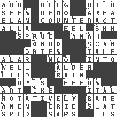 ACROSS 1. Say or write further 4. Cassini of fashion 8. Von Bismarck 12. Perceives with the eye 14. San ____ (Riviera town) 15. Length times width 16. Liveliness 17. Neutralize 20. Silent film actress Nazimova 21. Snakelike fish 22. Quiet! 23. Disorder 27. Housemaid 29. Southwest Nigerian state 31. Glance over 34. Off-Broadway awards 35. Story 36. Having or resembling wings 39. Non-commissioned officer (abbr.) 41. To the inside or interior of 42. Water source 43. Tree or shrub in the Birch family 46. _ and Stitch 47. Water falling in drops from the sky 48. Elects 51. Eats 54. Tate display 56. D.D.E's nickname 58. Slanted text style (abbr.) 61. Happening in regular succession 66. Object of repulsion 67. So be it 68. One of the Great Lakes 69. Narrow board 70. Broke a traffic law 71. Plant excrements 72. Raised railways DOWN 1. Toward the sea 2. Small valley 3. Allots cards 4. The grampus (Milton) 5. Lion 6. Australian flightless bird 7. Went 8. Boat paddle 9. File 13 10. Technician 11. Pledge 13. Fastener 18. Afternoon social gathering 19. Shade tree 24. Director Reiner 25. Corn or form start 26. Paradise 28. Having gotten out of bed 30. Motion picture award 32. Keyboard modifier key 33. Modern: prefix 34. Lowest deck of a ship 36. Leather borer 37. Luau accessory 38. One to whom something is allotted 40. Norwegian king 44. Pass on 45. Compass dir. 49. Teat (slang) 50. What Jean-Claude Killy likes to do 52. Rights 53. Showing deterioration from age 54. Ancient river in northeast Turkey 55. Frolic 57. Nights before holidays 59. Of or related to the anus 60. Allows 62. Added to 63. Epoch 64. Mouth edge 65. Consenting reply