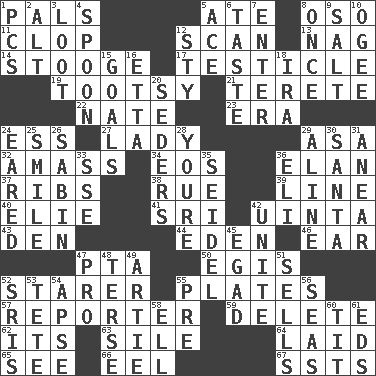 ACROSS 1. Friends 5. Had dinner 8. Bear (Spanish) 11. Hoof sound 12. Examine minutely or intensely 13. Tired old horse 14. Moe Howard, for one 17. A testis 19. A girl or young woman (variant) 21. Cylindrical with tapered ends 22. Nathan's nickname 23. Period 24. Curvy letter 27. Kenny Rogers chart-topper in '80 29. White ___ sheet 32. Collect or gather 34. Greek goddess of the dawn 36. Liveliness 37. Teases 38. Regret 39. Actor's bit 40. Writer Wiesel 41. Indian title of respect (Mr.) 42. National forest in Provo, Utah 43. Lair 44. Paradise 46. Ewer handle 47. Parent Teacher Association (abbr.) 50. The front part of a cuirass 52. A viewer who gazes fixedly 55. Food holders 57. Newsperson 59. Keyboard key 62. ___ a Wonderful Life 63. Filth; sediment 64. Put down 65. Observe 66. Snakelike fish 67. Fast planes DOWN 1. Personal Computers (abbr.) 2. Keyboard modifier key 3. Plunder 4. Soup utensil 5. Adept person 6. Clothes sense 7. Keyboard key 8. At one time in the past 9. Table seasoning 10. Double curve, resembling the letter S 12. Filthy place 15. Scores awarded for successful feats 16. Singer James 18. Lyricist Gershwin 20. Spring feasts 24. Having ears or earlike features 25. Grin 26. Unit of acoustic absorption 28. You are 29. Place in a line 30. Before Barbara or Clara 31. Approach 33. Compass dir. 35. Beer mug 36. Biblical high priest 42. Join together 45. Mild oath 47. Adept person 48. Laconic 49. Nick name for Arthur 51. Exchanges for money 52. Indian titles of respect 53. False hair 54. Domed church section 55. Before (prefix) 56. Oceans 58. Pipe bend 60. Teat (slang) 61. Begley and Asner