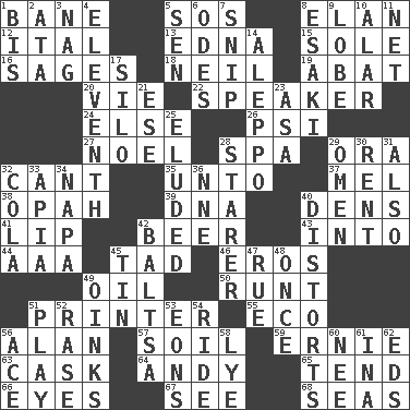 ACROSS 1. Object of repulsion 5. Distress signal 8. Flair 12. Slanted text style (abbr.) 13. Pulitzer Prize-winning author Ferber 15. Flatfish 16. Gurus 18. Famous astronaut Armstrong 19. Blind as ____ 20. Compete 22. Orator 24. Otherwise 26. Air pressure measure (abbr.) 27. Christmas carol 28. Health resort 29. Mouth or opening 32. Patter 35. To (old English) 37. Cartoonist voice _ Blanc 38. Brightly colored fish 39. Heredity factor (abbr.) 40. Habitations of wild animals 41. Mouth edge 42. Fermented drink made from hops 43. To the inside or interior of 44. American Automobile Association (abbr.) 45. Bit 46. Greek god of love 49. Petroleum 50. The smallest animal of a litter 51. Hard copy producer 55. Environmental prefix 56. ____ Jay Lerner 57. The visible part of the earth's surface 59. Bert's buddy 63. Keg 64. "60 Minutes" Commentator Rooney 65. Look after 66. Snake ____ (dice throw) 67. Observe 68. Oceans DOWN 1. Again 2. _ moment's notice (2 wds.) 3. Tired old horse 4. Veterans Day date 5. Elected rep. 6. Lyric poems 7. Clip 8. 1973 Nobel Price Winner (Physics) Leo 9. Ear part 10. Having or resembling wings 11. Fish or hair follower 14. City in Syria 17. Grain storage tower 21. Compass dir. 23. White ___ sheet 25. Evaded 28. A viewer who gazes fixedly 29. Presage 30. Monthly bill 31. In addition 32. Root beer relative 33. Capital of Western Samoa 34. California wine valley 36. Compass dir. 40. What propaganda does 42. Greek mezzo-soprano Agnes 45. Shallow baking pan 47. Regret 48. At one time in the past 49. Pig sounds 51. Frolic 52. To erase 53. Immeasurably long periods of time 54. Travel on or in a vehicle 56. Adept person 58. Sodium hydroxide 60. Born 61. _ tizzy (2 wds.) 62. Begley and Asner