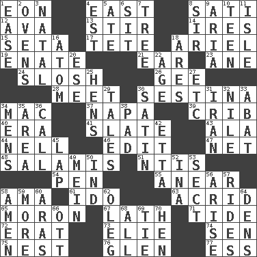 ACROSS 1. A really long time 4. Compass direction 8. Suttee (variant) 12. Actress Gardner 13. Disorderly outburst 14. Angers 15. Bristle 17. Wig 18. Satellite of Uranus 19. Maternal 21. Ewer handle 23. A saturated hydrocarbon 24. Splash clumsily 26. Unit of force equal to gravity 28. Rendezvous 30. French poetic form 34. Apple computer (short form) 37. California wine valley 39. Baby bed with high sides 40. Period 41. Chalkboard 43. According to 44. 1994 drama film starring Jodie Foster 46. Prepare for publication 47. Fish or hair follower 48. Deli grouping 51. Nuclear Threat Initiatives 54. Animal enclosure 55. Approach 58. Nanny (var.) 61. Wedding promise 63. Bitter 65. Person of subnormal intelligence 67. Thin strip of wood or metal 71. Event that recurs at intervals 72. Part of Q.E.F. 73. Writer Wiesel 74. Elected rep. 75. A home for chicks 76. Small, secluded valley 77. Double-curved letter DOWN 1. Comfort 2. Baking chambers 3. Brizilian seaport 4. Eastern Standard Time (abbr.) 5. Had dinner 6. Be seated 7. Family _ (genealogy) 8. Title for a knight 9. Roberta Peters solo 10. Adolescent 11. Small island 16. Smallest unit of an element 18. Ancient Greek god of war 20. Compass dir. 22. Ripen 25. Coop moms 27. And so on (abbr.) 29. Falsehoods 30. Smooth fabric 31. SW Asia republic 32. "Death on the ____" 33. Blind as ____ 34. Not women's 35. Type of rug 36. Give a ring to 38. Groovy apt. 42. Singer James 45. Infant locale 49. Chow _ 50. Indiana (abbr.) 52. _ tizzy (2 wds.) 53. Religious group 56. Get up 57. Amusement-park features 58. So be it 59. Greater amount 60. Ancient river in northeast Turkey 62. Cassini of fashion 64. Cub Scout units 66. Baseball player Mel 68. 100% 69. Neckwear 70. Layer