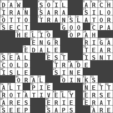 ACROSS 1. Simpleton 4. Earth 8. Bowlike part 12. SW Asia republic 14. "Two Mules for Sister ____" 15. Grain storage tower 16. "Beetle Bailey" pooch 17. Interpreter 20. Religious group 21. Thick or sticky substance 22. Accounting whiz (abbr.) 23. Sun: prefix 27. Brightly colored fish 29. Engineer (abbr.) 31. Capital of Latvia 34. Peak District village in England 35. Pull into pieces 36. Lick closed 39. Eastern Standard Time (abbr.) 41. Is not 42. Chilled 43. Swap 46. Capri or Wight 47. Trig term 48. Spoken 51. Pig sounds 54. The first octave above the treble staff 56. Sliced dessert 58. Remaining after all deductions 61. Happening in regular succession 66. Celtic language 67. Ancient Greek god of war 68. 4th largest of the Great Lakes 69. Part of Q.E.F. 70. Ooze 71. Plant excrements 72. "We ___ not amused" (Victoria) DOWN 1. "Vaya con ____" 2. Johnson of "Laugh-In" 3. Observe 4. Fast jet (abbr.) 5. Rowing implement 6. Retirement account (abbr.) 7. Long (Scottish) 8. White ___ sheet 9. Actors Guy, Robert Welles, and Clint 10. Hoof sound 11. Israeli folk dance 13. Brief written record 18. "Barney Miller" actor Jack 19. Trim (branches) 24. Directed 25. _ tizzy (2 wds.) 26. Stare at amorously 28. Nick name for Arthur 30. Musical pauses 32. Separate the seeds from cotton 33. Nonscientific branch of learning 34. A person who is older than you are 36. _-fi 37. Greek goddess of the dawn 38. One to whom something is allotted 40. Musical group of three 44. Black tropical American cuckoo 45. Lair 49. Fitting 50. Cards in a Roman deck? 52. Leg joint 53. Spanish missionary in California 54. Ancient river in northeast Turkey 55. Old wives' tales, e.g. 57. Nights before holidays 59. Russian ruler of old 60. Wig 62. Cleo's killer 63. Epoch 64. Mouth edge 65. Affirmative reply