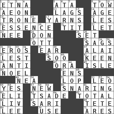 ACROSS 1. Inactive volcano in Sicily 5. _ moment's notice (2 wds.) 8. Pull behind 11. A really long time 12. Falls behind 14. Ripen 15. Heavy duty weighing machine 17. Entertaining tales 18. French article 19. Center 21. Teat (slang) 22. Allow 23. Born 24. Spanish title 25. Put into a specified state 27. Baseball player Mel 28. Droops 31. Greek god of love 35. Ewer handle 37. Jai _ 38. For fear that 39. "Barney Miller" actor Jack 41. Peachy ____! 42. Opposed to 43. Mouth or opening 45. Small island 46. Christmas carol 47. Followers of ems 49. Teachers' org. 51. Chop off 52. Lion 55. It is so 57. ___ Haven, CT 60. Catching in a trap 62. Connecticut Ivy Leaguer 63. Sadhe (variant) 65. "_____ Recall" 66. 54 in ancient Rome 67. Indian skirt 68. False hair 69. Area sheltered from the wind 70. Purpose 71. Ancient Greek god of war DOWN 1. Consumed 2. Laconic 3. Trap for birds or small mammals 4. Singer Murray 5. According to 6. Small pie 7. Hindu god of fire 8. Baron Munchausen's specialties 9. Double curve, resembling the letter S 10. 270 degrees 13. Fast planes 16. Inside; within (prefix) 17. Gossips 20. ____ d'Azur (French Riviera) 26. 1973 Nobel Price Winner (Physics) Leo 29. Highlander 30. Trig term 31. Liveliness 32. Western Nevada city 33. Clearly or manifestly demonstrative 34. Vertical member of a panel or frame 36. Friend of Pooh 40. Threatening words 44. At once, immediately (arch.) 48. Petty quarrel 50. Pismires 52. 61 cubic inches 53. Maternal 54. Stares 55. Shout 56. Writer Wiesel 58. Son of Isaac 59. Armed conflicts 61. Roll call or roster of names 64. Expire