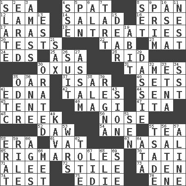 ACROSS 1. Ocean 4. Petty quarrel 8. Connect, as a bridge 12. Unable to walk 14. First course 16. Celtic language 17. Ancient river in northeast Turkey 18. Pleas 20. Trials 22. Bar bill 23. Floor covering 24. Begley and Asner 25. White ___ sheet 28. To free from 30. Amu Darya 31. Softens 35. Boat paddle 37. Austrian river, tributary to the Danube 40. Arranges properly for use 41. Pulitzer Prize-winning author Ferber 42. Stories 44. Emitted 45. Portable shelter 46. Wise men 47. Call ___ day 48. Small stream 50. Sense of smell 52. Obsolete 54. One (Scot) 55. Beverage made from leaves 58. Epoch 61. Large container 63. Relating to the nose 65. Complicated, petty procedures 70. Jacques of French films 71. Toward shelter 72. Vertical member of a panel or frame 73. Arabian gulf 74. Trial 75. Singer Brickell 76. Compass dir. DOWN 1. Schedule 2. Having ears or earlike features 3. Collect or gather 4. Compass dir. 5. Baking dish 6. Keyboard modifier key 7. Small pie 8. Put into a specified state 9. Demure 10. At sea 11. A home for chicks 13. Eastern Standard Time (abbr.) 15. Letter starter 19. "This won't hurt ____!" 21. Saxophone 26. Costume for a special activity 27. Indian state 29. Hyrax 30. Declaimed 32. Rendezvous 33. Inactive volcano in Sicily 34. Fast jet (abbr.) 35. River in Europe 36. Singer Murray 38. Chicken ___ king 39. Rain (Swedish) 41. And so on (abbr.) 43. The Jewish people; Israel 49. Polynesian shrub of the pepper family 51. Elected rep. 53. Armed conflicts 55. Sadhe (variant) 56. Consumed 57. Place in a line 58. Part of Q.E.F. 59. Cause heat under the collar 60. Grows older 62. Lug 64. "One Day ___ Time" 66. Was introduced to 67. Hat (slang) 68. Biblical high priest 69. Perceive with the eye
