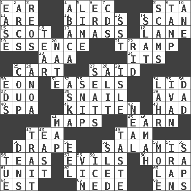 ACROSS 1. Hearing organ 4. Actor Baldwin 8. R.R. building 11. "We ___ not amused" (Victoria) 12. Avian creatures 14. Examine minutely or intensely 15. Highlander 17. Collect or gather 18. Unable to walk 19. Core 21. _____ steamer (cargo ship) 23. Auto club (abbr.) 24. ___ a Wonderful Life 25. Haul 27. Alleged 30. A really long time 31. Artist's stands 34. Flaplike covering 37. Superhero pair 38. Slow-paced one 39. Actress Gardner 40. Health resort 41. Baby cat 43. Possessed 44. Atlas contents 45. Merit 47. Afternoon social gathering 49. Scottish cap 50. Window treatment 52. Deli grouping 56. Beverages made from leaves 57. Vices 60. Israeli folk dance 61. A single undivided whole 62. It is permitted: Lat. 63. Infant locale 64. Eastern Standard Time (abbr.) 65. Ancient Persian 66. Followers of ems DOWN 1. Relaxation 2. Curves 3. Vintage cars 4. Phillipine bananalike plant 5. Citrus frut 6. Epoch 7. Music discs 8. Fraudulent business schemes 9. Pack (down) 10. One (Scot) 13. Fast jet (abbr.) 14. Narrow board 16. Lacerate 20. Nathan's nickname 22. To free from 25. Overturn; upset 26. Small Philippine buffalo 27. Theater features 28. Came down and settled, as after flight 29. Small island 30. Begley and Asner 32. "____ silly question..." 33. Sever or remove by pinching or nipping 34. Cowardly lion portrayer 35. _ the terrible 36. Male parent 42. Be tempered by heat 44. Atlas unit 46. Wet nurse 47. Distinguishing feature 48. Compass direction 49. Clothes sense 50. Lairs 51. Snakelike fish 52. Downhill vehicle 53. Undercover agent 54. SW Asia republic 55. Plant excrements 56. Third day of the wk. 58. Zeal 59. Frozen water