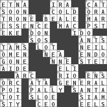 ACROSS 1. Inactive volcano in Sicily 5. Lyricist Gershwin 8. Domesticated feline 11. Within a short period 12. Having a low temperature 14. Mouth or opening 15. Heavy duty weighing machine 17. Memphis, Tenn. Street 18. Impair 19. Core 21. Apple computer (short form) 22. Pacific Standard Time (abbr.) 23. Supplement with great effort 24. Spanish title 25. Wedding promise 27. Distress signal 28. Pismires 31. Scottish caps 35. Car dealer's back yard 37. Famous astronaut Armstrong 38. Presage 39. Teachers' org. 41. Inside; within (prefix) 42. Went 43. Compass dir. 45. Proofreading order 46. Helper 47. Biblical high priest 49. Curve 51. River (Sp.) 52. Followers of ems 55. The grampus (Milton) 57. _ moment's notice (2 wds.) 60. Commissioned military rank 62. Luau course 63. Chummy 65. Before Barbara or Clara 66. Small child 67. _ gin 68. Thailand, formerly 69. Filthy place 70. Corporate head (abbr.) 71. Snakelike fish DOWN 1. First name in cosmetics 2. Cod relative 3. Trap for birds or small mammals 4. Queen of England 1702-14 5. Frozen water 6. Wander aimlessly 7. Silent film actress Nazimova 8. Part 9. Ancient river in northeast Turkey 10. Small pie 13. Tenth: prefix 16. Extremities 17. Gillaume's butler role 20. Calm and collected 26. Natives or inhabitants of Denmark 29. Event that recurs at intervals 30. Notch 31. Ancient Roman robe 32. Mine, in Marseilles 33. Ananias' fault 34. Scornful expression 36. Nine, plus one 40. Disorder of the immune system 44. Writer Wiesel 48. Charged atoms 50. Smile enhancers 52. Bert's buddy 53. Brizilian seaport 54. Criticizes harshly 55. Elects 56. Carrot, for example 58. Baby powder 59. Medicinal plant 61. Comfort 64. Lion