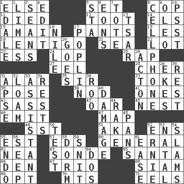 ACROSS 1. Otherwise 5. Arrange properly for use 8. Police officer (slang) 11. Passed on 12. A blast of a horn 14. Raised railways 15. With great haste 17. Leg coverings 18. French article 19. Small, flat, pigmented spot on the skin 21. Ocean 22. Car dealer's back yard 23. Curvy letter 24. Chop off 25. Hit sharply and swiftly 27. Snakelike fish 28. "Mermaids" star 31. Having or resembling wings 35. Title for a knight 37. Puff or smoke 38. Introduce or present, as a question 39. Allow head to fall sleepily 41. Washington bills 42. Backtalk 43. Boat paddle 45. A home for chicks 46. Send forth 47. Atlas unit 49. Fast jet (abbr.) 51. Alias (abbr.) 52. Followers of ems 55. Eastern Standard Time (abbr.) 57. Begley and Asner 60. Commissioned military rank 62. Teachers' org. 63. Message 65. Before Barbara or Clara 66. Lair 67. Musical group of three 68. Thailand, formerly 69. Elect 70. Mountains (abbr.) 71. Snakelike fish DOWN 1. Peak District village in England 2. Citrus fruits 3. Seines 4. Prepare for publication 5. R.R. building 6. Immeasurably long periods of time 7. Haul 8. Portable communications device 9. Margarine 10. Inconspicuous attention getter 13. Russian ruler of old 16. "Death on the ____" 17. Cotton for raincoats, e.g. 20. Moves 26. Gambison 29. Supplements with great effort 30. Take ten 31. Domed church section 32. Rich soil 33. Aide 34. Musical pauses 36. Friend of Pooh 40. Break 44. Libertine 48. Baking dishes 50. Trial 52. Bert's buddy 53. Brizilian seaport 54. Hits or strikes with great force 55. Inside; within (prefix) 56. Ooze 58. Dormintory (informal) 59. In a ____ (agitated or irritated) 61. Comfort 64. Two (Sp.)