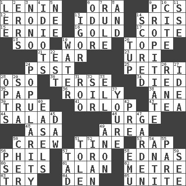 ACROSS 1. Soviet premier 1918-24 6. Mouth or opening 9. Personal Computers (abbr.) 12. Wear away 13. Goddess of spring and wife of Bragi 14. Indian titles of respect 15. Bert's buddy 16. Gilt 17. ____ d'Azur (French Riviera) 18. "Barney Miller" actor Jack 19. Had on 20. Drink excessively 21. Pull into pieces 23. RI univ. 24. Inconspicuous attention getter 25. _ dish (used to culture cells) 28. Bear (Spanish) 30. Laconic 34. Passed on 35. Infant food 36. Agitated, as a liquid 38. A saturated hydrocarbon 39. Loyal 41. Lowest deck of a ship 43. Afternoon social gathering 44. First course 46. Goad 48. White ___ sheet 49. Length times width 50. Ship's personnel 51. Prong on a fork 53. Reproach for some lapse or misdeed 56. Silvers or Donahue 57. "Corrida" creature 58. Ferber et al. 60. Arranges properly for use 61. Actor Alda or Thicke 62. Distance measurement (Brit.) 63. Attempt to accomplish something 64. Lair 65. Join together DOWN 1. Area sheltered from the wind 2. Blunders 3. Words to Nanette 4. Foolish or stupid persons 5. Born 6. Aroma 7. Court order 8. Plus 9. Conciliate 10. Quote 11. Compass dir. 13. Composer Stravinsky 14. Tallied 19. Wetness 20. Uncastrated adult male sheep 22. Eastern Standard Time (abbr.) 24. Teen's desire 26. French philosopher Descartes 27. The main thing one is thinking about 28. Elects 29. "Two Mules for Sister ____" 31. Friend of Pooh 32. Title for a knight 33. Pipe bend 37. You are 40. Artist's stands 42. Before (prefix) 45. Fool 47. Place where plants grow 49. Soon (poet.) 50. "Mermaids" star 51. Lacquered or enameled metalware 52. SW Asia republic 54. Against 55. Piece 56. Pacific Standard Time (abbr.) 57. Bit 58. Australian flightless bird 59. Observe