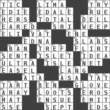 ACROSS 1. Nervous spasm 4. Pale green bean 8. Attempt to accomplish something 11. Singer Brickell 13. Peak District village in England 15. Regret 16. Possessive pronoun 17. "_____ Recall" 18. Small valley 19. Having ears or earlike features 21. _ Lanka 22. Shed a tear 23. Biblical high priest 24. Large container 27. Compass dir. 29. Pulitzer Prize-winning author Ferber 30. Thick slices 34. Bar 36. Not kosher 39. Seductive woman who exploits men 40. Posted 41. Small island 43. It may be bright or harebrained 44. Extreme 46. Capri or Wight 47. Remaining after all deductions 48. Artist's stand 49. Long (Scottish) 51. "One Day ___ Time" 53. White ___ sheet 54. Make lace 57. Small pie 60. Benjamin's nick name 63. Michael Jackson trademark 65. Like ___ of sunshine 66. Plunders 69. Greek god of love 70. Floor covering 71. Take place subsequently 72. Give off 73. Compass dir. 74. Back-to-school mo. 75. Begley and Asner DOWN 1. Giggle 2. Standard of perfection 3. High-altitude cloud 4. Allow 5. Wedding promise 6. Floor coverings 7. Having or resembling wings 8. Family _ (genealogy) 9. Governing power 10. Sharp bark 12. Compass dir. 14. Writer Wiesel 18. Residence 20. Movie disc 25. Against 26. Tarsus (plural) 28. Overdraft (abbr.) 29. Plea 31. Helper 32. Cy Young winner Saberhagen 33. R.R. building 34. Actor Lugosi 35. Pismires 37. Raised railways 38. Chap (slang) 40. Take to court 42. Beverages made from leaves 45. The first octave above the treble staff 50. Tired old horse 52. Competent 54. Singer Mel 55. Prevent the occurrence of 56. Trials 57. Scottish caps 58. Caspian sea tributary 59. Pace 61. Immeasurably long periods of time 62. Sense of smell 64. Area sheltered from the wind 67. Uncastrated adult male sheep 68. Put into a specified state