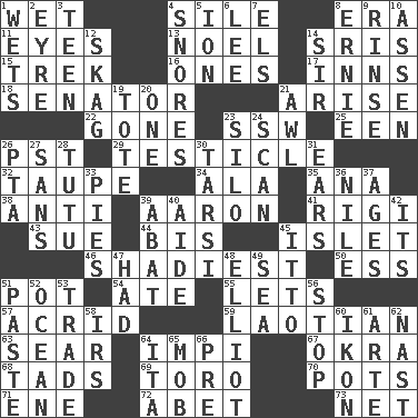 ACROSS 1. Dripping 4. Drop; flow; fall 8. Period 11. Snake ____ (dice throw) 13. Christmas carol 14. Indian titles of respect 15. Long journey 16. Singles 17. Lodging establishments 18. Elected representative 21. Originate 22. Went 23. Compass dir. 25. Car or cant ending 26. Pacific Standard Time (abbr.) 29. A testis 32. Grayish beige 34. In the manner of 35. Santa ___, CA 38. Against 39. Composer Copland 41. Swiss mountan, "Queen of the Mountains" 43. Take to court 44. Again 45. Small island 46. Most questionable 50. Curvy letter 51. Plant holder 54. Had dinner 55. Allows 57. Bitter 59. Of or relating to Laos or its people 63. Scorch 64. Body of Kaffir warriors 67. Gumbo ingredient 68. Bits 69. "Corrida" creature 70. Cooking vessels 71. Compass dir. 72. Collude with 73. Remaining after all deductions DOWN 1. Soaks 2. Jane of fiction 3. Adolescent 4. Sounds asleep 5. Electrically charged atom 6. Area sheltered from the wind 7. Raised railways 8. Bert's buddy 9. Wash lightly 10. NE Netherlands city 12. Heroin 14. Title for a knight 19. Haul 20. Single 21. Leather borer 23. Grain storage tower 24. Examine minutely or intensely 26. Parent Teacher Assoc. 27. Without 28. Ballerina skirt 30. Tarsus (plural) 31. Hearing organs 33. Sliced desserts 36. Mediterranean tributary 37. Eras 39. Blind as ____ 40. Assistant 42. ___ a Wonderful Life 45. "Tell ____ the Marines!" 47. Possessed 48. American author Paul (1891-1958) 49. Ocean 51. Thick mixture 52. Sea 53. Exchange 56. Close up, plug up 58. Big collection agency 60. Visual representation of an object 61. Johnson of "Laugh-In" 62. Political cartoonist Thomas 64. Call ___ day 65. Crowd into 66. Before (prefix)