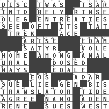 ACROSS 1. Flat circle 5. It was, poetically 9. Russian ruler of old 13. To the inside or interior of 14. Trust 15. Remove soap 16. Cassini of fashion 17. Pleas 19. Perceive with the eye 20. Often (poetically) 21. It is 22. Make lace 23. Long journey 25. Adept person 26. Ascend 30. Dutch treat 34. Man with strong sexual desires 35. Short-tailed, large-bodied rat 36. Residence 39. Amid 42. Of or related to the anus 43. Mountain range 44. Administered medicine 46. Negative votes 47. Peak District village in England 48. Greek goddess of the dawn 51. The sixth month of the Jewish calendar 54. Take to court 57. Whopper 58. Commissioned military rank (abbr.) 60. Altar cloth linen 62. Interpreter 65. Event that recurs at intervals 66. Match 67. Billionth: prefix 68. An important port of Yemen 69. French philosopher Descartes 70. Institutes legal proceedings 71. Compass direction DOWN 1. "Vaya con ____" 2. An arm off of a larger body of water 3. Bull 4. Gear tooth 5. Not kosher 6. Gone 7. The first octave above the treble staff 8. Damascus' land 9. Teat (slang) 10. In a ____ (agitated or irritated) 11. At sea 12. Take ten 15. To erase 18. And so on (abbr.) 20. Gumbo ingredient 24. Artist's stands 27. Call ___ day 28. Symbol (abbr.) 29. Eat (away) 30. Eluded 31. Spanish title 32. Wing 33. Cartoonist voice _ Blanc 36. Attila the _ 37. Mouth or opening 38. Fifth month 40. Allow head to fall sleepily 41. Girls' org. (abbr.) 45. Style 48. Otherwise 49. Lubricate 50. Seines 52. Stay 53. Amusement-park features 54. Play the lead 55. Goad 56. Merit 58. Went 59. Greek god of love 61. Transmitted 63. Born 64. The 19th letter of the Greek alphabet 65. The 23rd letter of the Hebrew alphabet