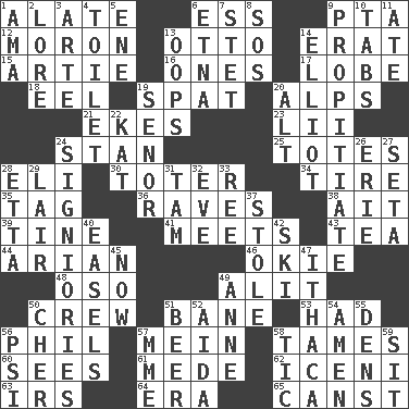 ACROSS 1. Having winglike extensions 6. Double-curved letter 9. Parent Teacher Association (abbr.) 12. Person of subnormal intelligence 13. "Beetle Bailey" pooch 14. Part of Q.E.F. 15. Nick name for Arthur 16. Washington bills 17. Ear part 18. Snakelike fish 19. Petty quarrel 20. High mountains 21. Makes supply last 23. Cards in a Roman deck? 24. Comedian Laurel of Laurel & Hardy 25. Hauls 28. Biblical high priest 30. Carrier 34. Become fatigued 35. Label 36. All-night dance parties 38. Small island 39. Prong on a fork 41. Confronts 43. Beverage made from leaves 44. Believer in; advocate of (suffix) 46. Migrant worker of the '30s 48. Bear (Spanish) 49. Set down 50. Group working together 51. Object of repulsion 53. Possessed 56. Silvers or Donahue 57. Count _ (2 wds.) 58. Makes less strong or intense 60. Observes 61. Ancient Persian 62. Ancient Celtic tribe of eastern Britain 63. Big collection agency 64. Period 65. 2nd pers. sing. pres. of can (arch.) DOWN 1. Nanny (var.) 2. Old wives' tales, e.g. 3. Johnson of "Laugh-In" 4. Bathroom plumbing fixture 5. Compass dir. 6. Inactive volcano in Sicily 7. Proofreading order 8. Distress signal 9. Appease 10. Bar bills 11. Had dinner 13. I made a mistake 14. American author Paul (1891-1958) 19. Sir (Sp.) 20. Keyboard modifier key 22. Krazy ___ of comics 24. Seigniories (variant) 26. One of the Great Lakes 27. Bristle 28. Singer James 29. Den 31. Scottish cap 32. Night before a holiday 33. Portuguese money of account (variant) 37. Fur scarf 40. Artist's stands 42. What Jean-Claude Killy likes to do 45. Immediately 47. New York city 49. Singer Murray 50. "Mermaids" star 51. Fermented drink made from hops 52. Opera by Verdi 54. So be it 55. Hiding places for outlaws 56. 23rd letter of the Greek alphabet 57. Madame (abbr.) 58. Nervous spasm 59. Be seated