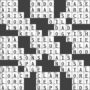 ACROSS 1. Environmental prefix 4. Southwest Nigerian state 8. Raze (variant) 12. Atmosphere 13. Of or related to the anus 14. Type of rug 15. Indian titles of respect 17. French philosopher Descartes 18. Religious groups 19. Wear away 21. Petroleum 23. Fast jet (abbr.) 24. Empty; void 26. June honoree 28. Seaweed 30. Out of fashion; old fashioned 34. Federal power corp. 37. Stitch closed the eyes of (a falcon) 39. One of the Great Lakes 40. Period of immesurable duration 41. Follow as a consequence or result 43. Insect wing 44. Medicinal plant 46. Famous astronaut Armstrong 47. Lower and raise head in agreement 48. Thinks logically 51. Raised platform 54. Health resort 55. Annoying sound 58. Shoshoni 61. Personal question 63. Relating to or accompanying birth 65. Team commander 67. Dollar (slang) 71. Greater amount 72. Old wives' tales, e.g. 73. Respite 74. Allow 75. In addition 76. United States Postal Service (abbr.) 77. Begley and Asner DOWN 1. Comfort 2. High-altitude cloud 3. Constellation of myth 4. Rowing implement 5. Compass dir. 6. Daniel's nick name 7. Margarine 8. Actress Charlotte 9. Arches 10. Puts into a specified state 11. 90 degrees 16. Neighbor of Neb. 18. Volcanic refuse 20. Compass dir. 22. Wedding promise 25. Otherwise 27. Color 29. Actor Sean's family 30. Watery 31. SW Asia republic 32. Grain storage tower 33. Froth on beer 34. Rend 35. Short-tailed, large-bodied rat 36. Small Philippine buffalo 38. Compass dir. 42. Liveliness 45. Curvy letter 49. Brightly colored fish 50. Tired old horse 52. Electrically charged atom 53. Thailand, formerly 56. Fur scarf 57. Having ears or earlike features 58. Southern CA. univ. 59. Instrument 60. Hearing organs 62. Shade of tan 64. Allows 66. Corporate head (abbr.) 68. French article 69. Cleo's killer 70. Mountains (abbr.)