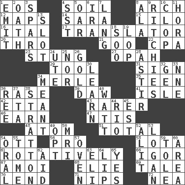 ACROSS 1. Greek goddess of the dawn 4. Earth 8. Bowlike part 12. Atlas contents 14. "Two Mules for Sister ____" 15. _ and Stitch 16. Slanted text style (abbr.) 17. Interpreter 20. Through, poetically 21. Thick or sticky substance 22. Accounting whiz (abbr.) 23. Feeling sharp psychological pain 27. Brightly colored fish 29. Utensil 31. Signal 34. Haggard of country music 35. Adolescent 36. Raze (variant) 39. Fool 41. Small island 42. Singer James 43. More uncommon 46. Merit 47. Nuclear Threat Initiatives 48. Tiny particle 51. "_____ Recall" 54. Baseball player Mel 56. Adept person 58. Globular water bottle used in Asia 61. Producing rotation 66. Russian composer Stravinsky 67. Mine, in Marseilles 68. Writer Wiesel 69. Story 70. Grant temporary use of 71. Cuts off 72. Teachers' org. DOWN 1. Give off 2. Pledge 3. Practice fights 4. Fast jet (abbr.) 5. Boat paddle 6. Retirement account (abbr.) 7. Austrian-born American filmmaker Fritz 8. According to 9. Actors Guy, Robert Welles, and Clint 10. Hoof sound 11. Israeli folk dance 13. Groove 18. "Barney Miller" actor Jack 19. Chop off 24. Shoshoni 25. Not either 26. Precious metal 28. Moving about 30. Memorize 32. Set 33. Compass dir. 34. Intended 36. Portuguese money of account (variant) 37. "One Day ___ Time" 38. Ski resort town in Vermont 40. Electrical Unit 44. _ de Janeiro 45. Eastern Standard Time (abbr.) 49. Elect 50. Medical imaging device (abbr.) 52. Set down 53. Utah city north of Ogden 54. Of the mouth 55. Heavy book 57. Baking chamber 59. Lacquered or enameled metalware 60. Type of rug 62. Assist 63. Biblical high priest 64. Mouth edge 65. Affirmative reply