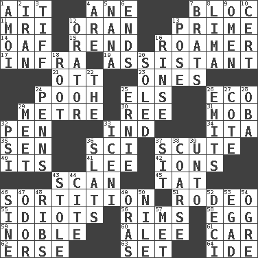 ACROSS 1. Small island 4. One (Scot) 7. Alliance 11. Medical imaging device (abbr.) 12. Northwest Algerian city 13. First class 14. Clumsy lout 15. Tear apart 16. Nomad 17. Kind of red light 19. Aide 21. Baseball player Mel 23. Singles 24. "Silly old bear" 25. Raised railways 26. Environmental prefix 29. Distance measurement (Brit.) 30. Portuguese money of account (variant) 31. Disorderly crowd 32. Fenced enclosure 33. Indiana (abbr.) 34. Call ___ day 35. Elected rep. 36. _-fi 37. Snake scale 40. ___ a Wonderful Life 41. Area sheltered from the wind 42. Charged atoms 43. Examine minutely or intensely 45. Make lace 46. Making a chance decision by using lots 51. Cowboy competition 55. Foolish or stupid persons 56. Basketball hoops 58. Ovum 59. Having high moral qualities 60. Toward shelter 61. Automobile 62. Celtic language 63. Put into a specified state 64. Binary compound DOWN 1. Mine, in Marseilles 2. SW Asia republic 3. Small quarrel 4. "We ___ not amused" (Victoria) 5. Nanny 6. Conclusions 7. Naughty children 8. Pale green bean 9. Sign of something about to happen 10. Certainty 12. Speaker 13. Introduce or present, as a question 16. Remove soap 18. Carrot, for example 20. Having a sole or soles 22. Definite Article 24. Actor Sean's family 25. Bert's buddy 26. Sends forth 27. ____ d'Azur (French Riviera) 28. Chief or king in Benin or Nigeria 29. Confront 32. Air pressure measure (abbr.) 33. Ancient Celtic tribe of eastern Britain 36. Narrow boards 37. Be seated 38. Rough 39. To (old English) 43. Fur scarf 44. Quote 46. Trig term 47. Aroma 48. Chest bones 49. Mouths or openings 50. "Death on the ____" 52. Tenth: prefix 53. Mild oath 54. Legendary monster 57. Was introduced to