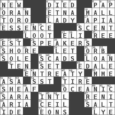ACROSS 1. ___ Haven, CT 4. Passed on 8. Infant food 11. NW Algerian seaport 13. Inactive volcano in Sicily 14. Promenade 15. "Corrida" creature 16. Kenny Rogers chart-topper in '80 17. Capital of Western Samoa 18. Center 21. Odor 22. Plunder 23. Connecticut Ivy Leaguer 25. To separate or throw off 26. Eastern Standard Time (abbr.) 29. Orators 32. Dinah or Pauly 34. Allow 35. Globe 38. Flatfish 39. Heaps 41. Grant temporary use of 43. Nine, plus one 44. Arrange properly for use 45. Peak District village in England 46. Plea 50. Madame (abbr.) 51. White ___ sheet 54. Fast jet (abbr.) 55. Become fatigued 57. Archer's quiver 59. Pertaining to the sea 63. "Two Mules for Sister ____" 64. International (abbr.) 67. Painter Guido (1575-1642) 68. Operatic vocal solo 69. To provide with a ceiling 70. Table seasoning 71. Binary compound 72. Immeasurably long periods of time 73. Potassium hydroxide DOWN 1. Musical sound 2. Greek god of love 3. Armed conflicts 4. Erase 5. Call ___ day 6. Conclusion 7. 24 hours 8. Some stationery 9. Place in a line 10. Food holder 12. Christmas carol 14. Big _ 19. Characteristic smell of wine 20. Police officer (slang) 21. Title for a knight 23. Made supply last 24. Allows 26. Double-curved letter 27. Guess 28. Lacquered or enameled metalware 30. Having winglike extensions 31. Exchanged or delivered for money 33. French philosopher Descartes 36. Wander 37. Lip ointment 39. Fast planes 40. Foregone conclusion 42. Born 45. Jane of fiction 47. Science/research agcy. 48. Ringlike coral islands and reefs 49. Nervous spasm 51. Slender Brazilian palm 52. Broken piece 53. Nest on high 56. Hearing organs 58. Auto club (abbr.) 60. Actress Patricia 61. In an inward manner 62. Quote 64. Frozen water 65. Modern: prefix 66. Metal container