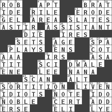 ACROSS 1. Director Reiner 4. Fitting 7. Naughty child 11. Binary compound 12. Cause heat under the collar 13. Wear away 14. Set 15. Type of rug 16. Chalkboards 17. Moving about 19. Helper 21. Pass on 23. Angers 24. Puts into a specified state 25. Ripen 26. Health resort 29. Live dramatic performances 30. Followers of ems 31. Small bed 32. American Automobile Association (abbr.) 33. Big collection agency 34. White ___ sheet 35. Teat (slang) 36. _-fi 37. A sleeping potion; an opiate (poet.) 40. Compass dir. 41. Area sheltered from the wind 42. Nanny 43. Examine hastily 45. Keyboard modifier key 46. Conclusion 51. Make or become more lively 55. Foolish or stupid persons 56. Brief written record 58. Wedding promise 59. Having high moral qualities 60. Foregone conclusion 61. Find the sum of 62. Celtic language 63. Connecticut Ivy Leaguer 64. Sodium hydroxide DOWN 1. Port city in Latvia 2. Lyric poems 3. Waist strap 4. Wind 5. Entreaty 6. Afternoon social gatherings 7. Naughty children 8. Roll call or roster of names 9. Arabian gulf 10. Trial 12. Noteworthy scarcity 13. Otherwise 16. Founders of families 18. The main thing one is thinking about 20. Signals 22. Curvy letter 24. Chalkboard 25. Nest on high 26. Any of the three canals of the cochlea 27. Introduce or present, as a question 28. "One Day ___ Time" 29. Ache 32. Had dinner 33. Ancient Celtic tribe of eastern Britain 36. Narrow boards 37. Heredity factor (abbr.) 38. Place for singles 39. Against 43. Took without asking 44. Quote 46. Trig term 47. Aroma 48. Chest bones 49. At one time in the past 50. Christmas carol 52. Small bottle 53. Whirlpool 54. Thickened enlargement 57. Three (prefix)