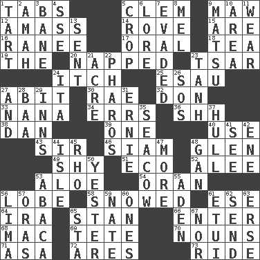 ACROSS 1. Bar bills 5. Clement's nick name 9. Informal term for the mouth 12. Collect or gather 14. Be footloose 15. "We ___ not amused" (Victoria) 16. Indian princess (variant) 17. Relating to the mouth 18. Beverage made from leaves 19. Definite Article 20. Slept 23. Russian ruler of old 24. Hankering 25. Son of Isaac 27. "This won't hurt ____!" 30. Actress Charlotte 32. Spanish title 33. Grandmother 34. Blunders 36. Quiet! 38. One of the 12 tribes of Israel 39. Single 40. Purpose 43. Title for a knight 46. Thailand, formerly 48. Small, secluded valley 49. Like a shrinking violet 51. Environmental prefix 52. Toward shelter 53. _ vera 54. NW Algerian seaport 56. Ear part 58. Frozen precipiation fell 61. Compass dir. 64. Retirement account (abbr.) 65. Comedian Laurel of Laurel & Hardy 66. Keyboard key 68. Apple computer (short form) 69. False hair 70. Parts of speech 71. White ___ sheet 72. Ancient Greek god of war 73. Travel on an animal DOWN 1. Small pie 2. Nursemaid 3. Object of repulsion 4. Compass dir. 5. Riding implement 6. Old wives' tales, e.g. 7. Dodged 8. Cartoonist voice _ Blanc 9. Taiwanese island in East China Sea 10. Length times width 11. Erode 13. Emitted 21. Measure of real estate 22. N Egypt peninsula 23. Hyperbolic tangent 24. Call ___ day 26. Distress signal 27. Plus 28. Sound made by sheep 29. Taverns 31. Bert's buddy 35. Manatee 37. Frame or body of a ship 41. Observe 42. Compass dir. 44. Small island 45. 17th letter of the Greek alphabet 47. Greater amount 48. Separate the seeds from cotton 50. Of or pertaining to yesterday 53. Phillipine bananalike plant 55. Arabian gulf 56. Pale green bean 57. Mouths or openings 59. Nathan's nickname 60. Washington bills 61. Needle holder 62. Transmit 63. Celtic language 65. R.R. building 67. Not either
