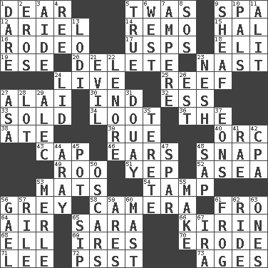 ACROSS 1. Letter starter 5. It was, poetically 9. Health resort 12. Satellite of Uranus 14. San ____ (Riviera town) 15. Actor Linden 16. Cowboy competition 17. United States Postal Service (abbr.) 18. Biblical high priest 19. Compass dir. 20. Erase 23. Political cartoonist Thomas 24. Not recorded 25. Coral ridge 27. Jai _ 30. Indiana (abbr.) 32. Double-curved letter 33. Exchanged or delivered for money 34. Plunder 36. Definite Article 38. Had dinner 39. Sorrow 40. The grampus (Milton) 43. Head covering 46. Hearing organs 48. Fastener 49. Friend of Pooh 51. Slangy assent 52. At sea 53. Floor coverings 54. Pack (down) 56. Jennifer or Joel 58. Device for capturing images 61. Back 64. Wind 65. "Two Mules for Sister ____" 66. Japanese brewing company 68. Pipe bend 69. Angers 70. Wear away 71. Area sheltered from the wind 72. Inconspicuous attention getter 73. Grows older DOWN 1. Have the gumption 2. Greek god of love 3. Assistant 4. Portuguese money of account (variant) 5. Loyal 6. Compass direction 7. Electrical Unit 8. Mayday 9. Bundle of cut stalks of grain 10. Friends 11. Came down and settled, as after flight 13. Farming town in central California 21. Morally bad or wrong 22. Poe poem 23. Delicate 24. Flaplike covering 26. Eastern Standard Time (abbr.) 27. White ___ sheet 28. Car dealer's back yard 29. Actor Baldwin 31. A city in N France, SE of Calais 35. Cigar-shaped 37. Immeasurably long periods of time 41. Actress Charlotte 42. Accounting whiz (abbr.) 44. Like ___ of sunshine 45. Cooking vessel 47. Practice fight 48. Plant excrement 50. Motion picture awards 53. Haggard of country music 55. Create 56. Highlander 57. Cause heat under the collar 59. Ancient Greek god of war 60. Vertical spar for supporting sails 61. Tree-dwelling hopper 62. Travel on or in a vehicle 63. Washington bills 65. Small drink 67. Retirement account (abbr.)