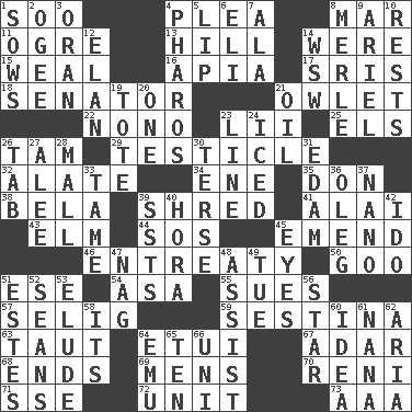 ACROSS 1. "Barney Miller" actor Jack 4. Entreaty 8. Make imperfect 11. Legendary monster 13. Land elevation 14. Past tense of be (plural) 15. Welt 16. Capital of Western Samoa 17. Indian titles of respect 18. Legislator 21. A small or young owl 22. Words to Nanette 23. Cards in a Roman deck? 25. Raised railways 26. Scottish cap 29. One of the two male reproductive glands 32. Having winglike extensions 34. Compass dir. 35. Spanish title 38. Actor Lugosi 39. Fragment 41. Mountain range southwest of Kyrgyzstan 43. Shade tree 44. Mayday 45. Make improvements or corrections to 46. Plea 50. Thick or sticky substance 51. Compass dir. 54. White ___ sheet 55. Institutes legal proceedings 57. Former Milwaukee Brewers owner Bud 59. French poetic form 63. Drawn tight 64. Needle case 67. The sixth month of the Jewish calendar 68. Conclusions 69. Not women's 70. Painter Guido (1575-1642) 71. Compass dir. 72. A single undivided whole 73. American Automobile Association (abbr.) DOWN 1. Sty mamas 2. Double curve, resembling the letter S 3. NW Algerian seaport 4. N Egypt peninsula 5. Mouth edge 6. Connecticut Ivy Leaguer 7. According to 8. Haggard of country music 9. Satellite of Uranus 10. Musical pauses 12. Style 14. Compass dir. 19. Carryall 20. Single 21. Petroleum 23. Actor's bit 24. On the rocks 26. Bar bill 27. Toward shelter 28. Shopping center 30. Laconic 31. Dutch treat 33. Docile 36. Cassini of fashion 37. Billionth: prefix 39. Fast planes 40. Israeli folk dance 42. Wedding promise 45. Sight organs 47. Tired old horse 48. Aid 49. Third day of the wk. 51. _____ Park, CO 52. Seines 53. Dodge 56. Play the lead 58. ___ a Wonderful Life 60. The content of cognition 61. Nanny 62. Roberta Peters solo 64. Australian flightless bird 65. Nine, plus one 66. University (slang)