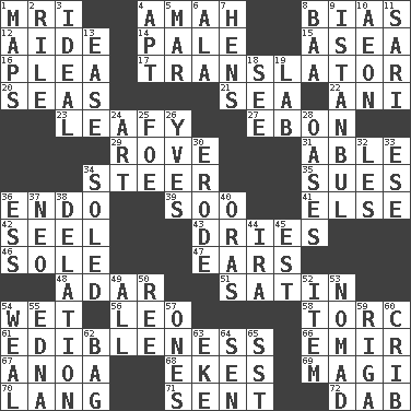 ACROSS 1. Medical imaging device (abbr.) 4. Nursemaid 8. Prejudice 12. Helper 14. Diluted with white 15. Toward the sea 16. Entreaty 17. Interpreter 20. Oceans 21. Ocean 22. Black tropical American cuckoo 23. Like summer trees 27. Inky black, to poets 29. Be footloose 31. Competent 34. Guide 35. Institutes legal proceedings 36. Inside; within (prefix) 39. "Barney Miller" actor Jack 41. Otherwise 42. Stitch closed the eyes of (a falcon) 43. Frees from moisture 46. Not divided or shared with others 47. Hearing organs 48. The sixth month of the Jewish calendar 51. Smooth fabric 54. Dripping 56. Lion 58. Torque (variant) 61. The property of being fit to eat 66. Independent ruler or chieftain 67. Small Philippine buffalo 68. Supplements with great effort 69. Wise men 70. Long (Scottish) 71. Transmitted 72. Apply (a substance) by light strokes DOWN 1. Atlas contents 2. Cause heat under the collar 3. Standard of perfection 4. Fitting 5. Third mo. 6. Insect wing 7. Coop moms 8. Sound made by sheep 9. Byzantium, centuries later 10. A really long time 11. Indian skirt 13. Relaxation 18. Perceive with the eye 19. Experiment locale 24. Tate display 25. Enemy 26. Jacques Cousteau's middle name 28. Fertile tracts in a desert 30. Eat (away) 32. French article 33. Compass dir. 34. Having a sole or soles 36. Curvy letter 37. Modern: prefix 38. Conveyance 40. Mouths or openings 44. Lyricist Gershwin 45. Eastern Standard Time (abbr.) 49. Everything 50. To riddle 52. A whole individual unit 53. Wanderer 54. Welt 55. Pulitzer Prize-winning author Ferber 57. Singles 59. Port city in Latvia 60. Baby bed with high sides 62. Paper or plastic container 63. Make supply last 64. Elected rep. 65. Fast jet (abbr.)