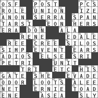 ACROSS 1. Order of Saint Francis (abbr.) 4. Mail 8. Personal Computers (abbr.) 11. Hero or heavy, e.g. 13. The state of being joined or united 15. Ending with capital 16. Soon (poet.) 17. Father Junipero _ 18. Connect, as a bridge 19. Tarsus (plural) 21. Period of immesurable duration 22. Possessive pronoun 23. Period 24. Spanish title 27. In the manner of 29. French philosopher Descartes 30. Peak District village in England 34. To separate or throw off 36. Algonquian 39. Grain storage towers 40. Simple or foolish person 41. Incident 43. Hearing organs 44. Goodbye (Sp.) 46. Otherwise 47. _ Lanka 48. _ dish (used to culture cells) 49. A single undivided whole 51. Three (prefix) 53. And so on (abbr.) 54. Part of HMS, perhaps 57. Yard entry 60. A female animal or person 63. Elude 65. Scent 66. Plunders 69. Toward shelter 70. Fish or hair follower 71. Bert's buddy 72. Frog relative 73. Compass dir. 74. Toward the sea 75. Insidious DOWN 1. Speak pompously 2. Underwater navigation system 3. Plants 4. Fluid product of inflammation 5. Single 6. Father 7. "Corrida" creature 8. Corncob 9. Russian ruler of old 10. Elected reps. 12. Followers of ems 14. Nanny 18. Most dark, concealed or hidden 20. Binary compound 25. At one time in the past 26. Boldness 28. French article 29. News announcer 31. Having or resembling wings 32. Australian parrot (variant) 33. Double-curved letter 34. Travel on or in a vehicle 35. Send forth 37. Snakelike fish 38. Take place subsequently 40. Plant excrement 42. Portable shelter 45. Title for a knight 50. Frozen water 52. Small island 54. Saint headwear 55. Perfect 56. Morally degraded 57. Went 58. Arabian gulf 59. Carry 61. Israeli folk dance 62. Immeasurably long periods of time 64. Large container 67. Neckwear 68. Ocean