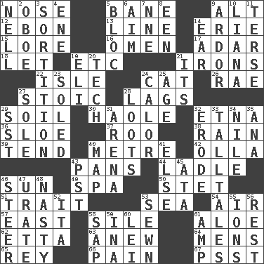 ACROSS 1. Sense of smell 5. Object of repulsion 9. Keyboard modifier key 12. Inky black, to poets 13. Actor's bit 14. 4th largest of the Great Lakes 15. Old wives' tales, e.g. 16. Sign of things to come 17. The sixth month of the Jewish calendar 18. Allow 19. And so on (abbr.) 21. Metal shackles 22. Capri or Wight 24. Domesticated feline 26. Actress Charlotte 27. Unemotional 28. Fails to keep up a pace 29. The visible part of the earth's surface 30. White Person, in Hawaii 32. Inactive volcano in Sicily 36. A type of plum 37. Friend of Pooh 38. Water falling in drops from the sky 39. Be inclined (to) 40. Distance measurement (Brit.) 42. Spanish pot 43. Zero-star reviews 44. Dipping utensil 46. Player for Phoenix 49. Health resort 50. Proofreading order 51. Distinguishing feature 53. Ocean 54. Atmosphere 57. 90 degrees 58. Drop; flow; fall 61. _ vera 62. Singer James 63. Afresh 64. Not women's 65. Marina Del _, California 66. Ache 67. Inconspicuous attention getter DOWN 1. 1994 drama film starring Jodie Foster 2. Mitch Miller's instrument 3. Casting lots 4. Compass dir. 5. Group of countries in special alliance 6. Direct toward a target or goal 7. Compass dir. 8. Car or cant ending 9. Zeal 10. Woody, climbing, usually tropical plant 11. Laconic 14. Hearing organ 19. Biblical high priest 20. Technology 21. ___ a Wonderful Life 23. Having a sole or soles 24. Bodily heat indicating an inflammation 25. Ripen 27. Not divided or shared with others 28. Plunders 29. Fast jet (abbr.) 31. Sports stadium 32. Wear away 33. Baron Munchausen's specialties 34. The longest river in the world 35. Santa ___, CA 40. Atlas unit 41. Otherwise 43. Pacific Standard Time (abbr.) 45. _ moment's notice (2 wds.) 46. Navigate 47. A salt of uric acid 48. Thoroughly unpleasant 52. Call ___ day 53. Stitched 55. Charged atoms 56. Take ten 58. Plant excrement 59. _ tizzy (2 wds.) 60. Luau accessory 61. Electrical Unit
