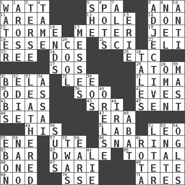 ACROSS 1. Electrical Unit 5. Health resort 8. Santa ___, CA 11. Length times width 12. Hollow 14. Spanish title 15. Singer Mel 17. Distance measurement 18. Type of plane 19. Center 21. _-fi 22. Connecticut Ivy Leaguer 23. Portuguese money of account (variant) 24. Two (Sp.) 25. And so on (abbr.) 27. Distress signal 28. Smallest unit of an element 31. Actor Lugosi 35. Area sheltered from the wind 37. Pale green bean 38. Lyric poems 39. "Barney Miller" actor Jack 41. Nights before holidays 42. Prejudice 43. _ Lanka 45. Posted 46. Stalk of a moss capsule 47. Period 49. Part of HMS, perhaps 51. Experiment locale 52. Lion 55. Compass dir. 57. Shoshoni 60. Catching in a trap 62. Tavern 63. A sleeping potion; an opiate (poet.) 65. Add up to 66. Single 67. Indian skirt 68. Wig 69. Lower and raise head in agreement 70. Compass dir. 71. Ancient Greek god of war DOWN 1. Wetness 2. Came up 3. Laconic 4. Not wild 5. A female animal or person 6. Plant holders 7. Actor Baldwin 8. Descriptive word 9. Christmas carol 10. Against 13. 4th largest of the Great Lakes 16. Conclusions 17. Makes clutter 20. Calm and collected 26. Stories 29. Sign of things to come 30. Vertical spar for supporting sails 31. Moves up and down 32. Singer Brickell 33. Resembling or made to resemble leather 34. Slender Brazilian palm 36. Greek goddess of the dawn 40. Threatening words 44. SW Asia republic 48. Blind as ____ 50. Beer foam 52. 61 cubic inches 53. Related on the mother's side 54. Stares 55. Inky black, to poets 56. Billionth: prefix 58. It was, poetically 59. Hearing organs 61. Roll call or roster of names 64. Whopper
