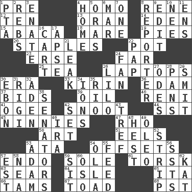 ACROSS 1. Before (prefix) 4. Same (prefix) 8. French philosopher Descartes 12. "___ Little Indians" 13. NW Algerian seaport 14. Locale of original sin 15. Phillipine bananalike plant 18. Female horse 19. Sliced desserts 20. Paper fasteners 22. Plant holder 23. Celtic language 24. At a great distance 25. Beverage made from leaves 26. Portable computers 30. Period 33. Japanese brewing company 36. Dutch treat 37. Auction offers 39. Petroleum 40. Painter Guido (1575-1642) 41. Double curve, resembling the letter S 42. Snout, nose 44. Fast jet (abbr.) 45. Simpletons 47. 17th letter of the Greek alphabet 50. Nonscientific branch of learning 51. Snakelike fish 53. _ moment's notice (2 wds.) 54. Counterbalances 57. Inside; within (prefix) 59. Flatfish 61. Cod relative 63. Singe 64. Small island 65. Call ___ day 66. Scottish caps 67. Frog relative 68. Pacific Standard Time (abbr.) DOWN 1. Parent Teacher Assoc. 2. Confederate soldiers (slang) 3. Maternal 4. Residence 5. Mouths or openings 6. Spoil 7. Single 8. Newsperson 9. Prepare for publication 10. Born 11. Followers of ems 16. Draw slowly or heavily 17. Domed church section 21. Path through which fluid escapes 22. Infant food 24. Air blower 26. _ and Stitch 27. Lyric poems 28. Baking dishes 29. Stricken, poetically 30. Inky black, to poets 31. Swiss mountan, "Queen of the Mountains" 32. Arabian gulf 34. Charged atoms 35. _ de Janeiro 38. Legislators 42. Put into a specified state 43. Unclean, religiously 46. Lyricist Gershwin 48. Behest 49. Butter sub 52. Remove all contents or possession from 53. First man 54. Water jar 55. Nourish 56. Fast planes 57. Eastern Standard Time (abbr.) 58. Teachers' org. 59. Be seated 60. Bear (Spanish) 62. Krazy ___ of comics