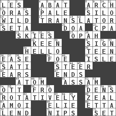 ACROSS 1. French article 4. Blind as ____ 8. Bowlike part 12. Mouths or openings 14. Light colored 15. Grain storage tower 16. Rampant 17. Interpreter 20. Stalk of a moss capsule 21. ___ good deed 22. Tax preparer (abbr.) 23. Atmospheres 27. Brightly colored fish 29. Peachy ____! 31. Attach a signature 34. Phone greeting 35. Adolescent 36. Comfort 39. Enemy 41. Small island 42. Suttee (variant) 43. Navigate 46. Hearing organs 47. Extremities 48. Smallest unit of an element 51. Indian state 54. Baseball player Mel 56. Away 58. Habitations of wild animals 61. Rotating or pertaining to rotation 66. Ardor 67. Mine, in Marseilles 68. Writer Wiesel 69. Singer James 70. Grant temporary use of 71. Cuts off 72. Arrange properly for use DOWN 1. Coldest temperatures 2. One of the Great Lakes 3. Table seasonings 4. Fitting 5. Soap unit 6. Wing 7. Be inclined (to) 8. White ___ sheet 9. Actors Guy, Robert Welles, and Clint 10. Hoof sound 11. Israeli folk dance 13. Neighbor of Neb. 18. "Barney Miller" actor Jack 19. Infant locale 24. Eisenhower's nickname 25. Snakelike fish 26. Oneself 28. Being in motion 30. Trap for birds or small mammals 32. Set 33. Compass dir. 34. Robbery 36. Compass dir. 37. Auto club (abbr.) 38. Ski resort town in Vermont 40. Inactive volcano in Sicily 44. Begley and Asner 45. Curvy letter 49. Often (poetically) 50. Medical imaging device (abbr.) 52. Axlike tool, used for shaping wood 53. Confronts 54. Relating to the mouth 55. Heavy book 57. Baking chamber 59. Nathan's nickname 60. Narrow board 62. Assist 63. Biblical high priest 64. Mouth edge 65. It is so