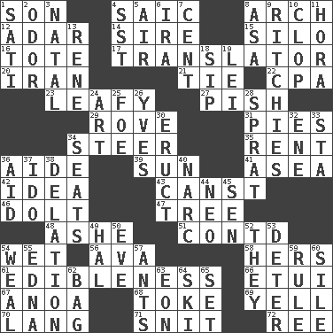 ACROSS 1. Boy, to dad 4. Ketch in the Levant 8. Bowlike part 12. The sixth month of the Jewish calendar 14. Beget 15. Grain storage tower 16. Haul 17. Interpreter 20. SW Asia republic 21. Neckwear 22. Tax preparer (abbr.) 23. Like summer trees 27. Expression of disdain 29. Be footloose 31. Sliced desserts 34. Navigate 35. Monthly bill 36. Helper 39. Player for Phoenix 41. Toward the sea 42. It may be bright or harebrained 43. 2nd pers. sing. pres. of can (arch.) 46. Stupid person 47. Woody plant 48. American tennis player Robert 51. Continued (abbr.) 54. Soggy 56. Actress Gardner 58. Possessive pronoun 61. The property of being fit to eat 66. Needle holder 67. Small Philippine buffalo 68. Casino tip 69. Shout 70. Austrian-born American filmmaker Fritz 71. In a ____ (agitated or irritated) 72. Portuguese money of account (variant) DOWN 1. Suttee (variant) 2. Scent 3. Brizilian seaport 4. Fast jet (abbr.) 5. Wind 6. Lyricist Gershwin 7. Penny 8. White ___ sheet 9. Actors Guy, Robert Welles, and Clint 10. Hoof sound 11. Israeli folk dance 13. French philosopher Descartes 18. Small drink 19. Flowery wreath 24. Tate display 25. Enemy 26. Jacques Cousteau's middle name 28. Small fatty European fish 30. Spew [out] 32. Compass dir. 33. R.R. building 34. Theater features 36. Assist 37. Wedding promise 38. Conveyance 40. Drug cop 44. Modern: prefix 45. Elected rep. 49. Actor Linden 50. First lady 52. Those people 53. Prevent from occurring 54. Welt 55. Pulitzer Prize-winning author Ferber 57. Pismires 59. Governing power 60. Filth; sediment 62. Container for groceries 63. Period of immesurable duration 64. What Jean-Claude Killy likes to do 65. Put into a specified state
