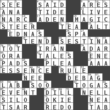 ACROSS 1. Observe 4. Stated 8. Ancient Greek god of war 12. Santa ___, CA 13. Event that recurs at intervals 14. Moving, as bait 15. Drug cop 17. Arabian gulf 18. Mysterious quality of enchantment 19. Navigate 21. Afternoon social gathering 23. The first octave above the treble staff 24. Ferber et al. 26. Health resort 28. Watch over 30. French poetic form 34. Small child 37. SW Asia republic 39. The sixth month of the Jewish calendar 40. Mouth or opening 41. Stories 43. Compass dir. 44. Writing tablets 46. Entreaty 47. Auto club (abbr.) 48. Center 51. General guideline 54. Born 55. Debunk (Brit. slang) 58. Experiment locale 61. "Barney Miller" actor Jack 63. Ancient Roman robes 65. Happening 67. Deli pickle 71. 1994 drama film starring Jodie Foster 72. Grain storage tower 73. Migrant worker of the '30s 74. Teachers' org. 75. Russian ruler of old 76. Make new 77. Bar bill DOWN 1. Without 2. Related on the mother's side 3. Having ears or earlike features 4. R.R. building 5. Assist 6. Binary compound 7. Gouge 8. Insect wing 9. Port city in Latvia 10. Tending to cause great harm 11. Religious group 16. Penny 18. Atlas contents 20. Actress Charlotte 22. Compass dir. 25. In a ____ (agitated or irritated) 27. _ moment's notice (2 wds.) 29. Window treatment 30. Contemptuous expression 31. It may be bright or harebrained 32. Grandmother 33. Length times width 34. Drink excessively 35. Mouths or openings 36. Small amounts or degrees 38. 100% 42. Saudi Arabian king (1953-1964) 45. Elected rep. 49. Egg locale 50. Corporate head (abbr.) 52. Allow 53. Inky black, to poets 56. Representative 57. An organ shaped like a helmet 58. For fear that 59. Opinion 60. Actor Lugosi 62. Scent 64. Broad, flat, thick piece 66. And not 68. D.D.E's nickname 69. Flaplike covering 70. Lion