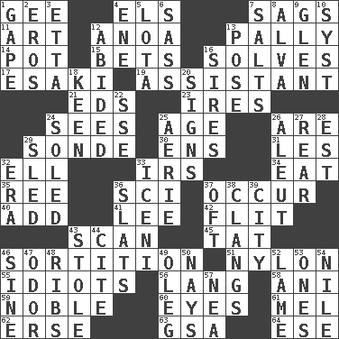 ACROSS 1. Turn to the right 4. Raised railways 7. Droops 11. Nonscientific branch of learning 12. Small Philippine buffalo 13. Friendly 14. Plant holder 15. Wagers 16. Finds the solution 17. 1973 Nobel Price Winner (Physics) Leo 19. Helper 21. Begley and Asner 23. Angers 24. Observes 25. Ripen 26. "We ___ not amused" (Victoria) 29. Something which is sent 30. Followers of ems 31. French article 32. Pipe bend 33. Big collection agency 34. Erode 35. To riddle 36. _-fi 37. Happen 40. Find the sum of 41. Area sheltered from the wind 42. Secret move to avoid paying debts 43. Glance over 45. Make lace 46. Making a chance decision by using lots 51. High-strength synthetic material 55. Foolish or stupid persons 56. Long (Scottish) 58. Black tropical American cuckoo 59. Impressive in appearance 60. Sight organs 61. Cartoonist voice _ Blanc 62. Celtic language 63. Girls' org. (abbr.) 64. Compass dir. DOWN 1. Open wide 2. Greek god of love 3. Singer James 4. Compass dir. 5. Globular water bottle used in Asia 6. Backtalk 7. Table seasonings 8. Inventor's middle name 9. Small, secluded valley 10. System (abbr.) 12. Remained 13. Introduce or present, as a question 16. Fathers 18. Peachy ____! 20. Attaches a signature 22. Compass dir. 24. Having a sole or soles 25. Nest on high 26. Eskimo relative 27. Stern 28. Eastern Standard Time (abbr.) 29. Downhill vehicle 32. Period 33. Ancient Celtic tribe of eastern Britain 36. Narrow boards 37. Often (poetically) 38. Rigngs loudly 39. Municipality 43. Fur scarf 44. Quote 46. Trig term 47. Aroma 48. Chest bones 49. Cassini of fashion 50. Negative votes 52. Unable to walk 53. Singles 54. Mediterranean tributary 57. Teachers' org.