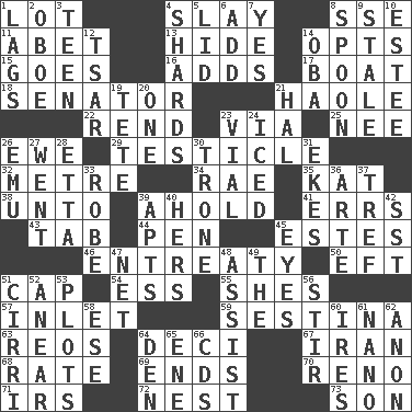 ACROSS 1. Car dealer's back yard 4. Kill 8. Compass dir. 11. Collude with 13. Flintstone garb 14. Elects 15. Leaves 16. Sums up 17. Water vessel 18. Elected representative 21. White Person, in Hawaii 22. Tear apart 23. By way of 25. Born 26. She-sheep 29. A testis 32. Distance measurement (Brit.) 34. Actress Charlotte 35. Krazy ___ of comics 38. To (old English) 39. Hold, grip (Informal) 41. Blunders 43. Bar bill 44. Animal enclosure 45. _____ Park, CO 46. Plea 50. Newt 51. Head covering 54. Double-curved letter 55. "______ My Girl" (Turtles hit) 57. An arm off of a larger body of water 59. French poetic form 63. Vintage cars 64. Tenth: prefix 67. SW Asia republic 68. Pace 69. Conclusions 70. Western Nevada city 71. Big collection agency 72. Egg locale 73. Male offspring DOWN 1. Falls behind 2. Mitch Miller's instrument 3. Adolescent 4. Pottery fragments 5. Flaplike covering 6. Increase 7. It is so 8. Soup utensil 9. Lacking originality or spontaneity 10. First name in cosmetics 12. Russian ruler of old 14. Chief or king in Benin or Nigeria 19. Wig 20. Single 21. Actor Linden 23. Small bottle 24. On the rocks 26. Australian flightless bird 27. Gone 28. Singer James 30. Heavy duty weighing machine 31. Supplements with great effort 33. Loose flowing garment 36. Johnson of "Laugh-In" 37. Unclean, religiously 39. Flats, for short 40. Possessive pronoun 42. Fast jet (abbr.) 45. Snake ____ (dice throw) 47. Remaining after all deductions 48. Aid 49. Definite Article 51. High-altitude cloud 52. Approach 53. Small pieces of grounds 56. Agitate 58. Compass dir. 60. Angers 61. Billionth: prefix 62. At once, immediately (arch.) 64. Lair 65. Compass dir. 66. Music discs