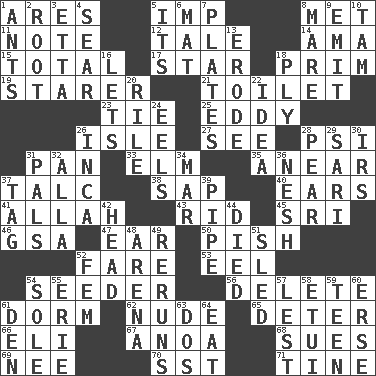 ACROSS 1. Ancient Greek god of war 5. Mischievous child 8. Was introduced to 11. Brief written record 12. Lie 14. Nursemaid (var.) 15. Add up to 17. Play the lead 18. Demure 19. A viewer who gazes fixedly 21. Bathroom plumbing fixture 23. Make a knot 25. Whirlpool 26. Small island 27. Observe 28. Air pressure measure (abbr.) 31. Baking dish 33. Shade tree 35. Approach 37. Baby powder 38. Plant excrement 40. Hearing organs 41. Assad's deity 43. To free from 45. _ Lanka 46. Girls' org. (abbr.) 47. Hearing organ 50. Expression of disdain 52. Conductor's collection 53. Snakelike fish 54. Sowing specialist 56. Keyboard key 61. Dormintory (informal) 62. Naked 65. Prevent from occurring 66. Connecticut Ivy Leaguer 67. Small Philippine buffalo 68. Takes to court 69. Born 70. Fast jet (abbr.) 71. Prong on a fork DOWN 1. Pismires 2. Carrot, for example 3. Singer James 4. Dry up 5. It is 6. Floor covering 7. Food holders 8. Female horse 9. Give off 10. Scottish cap 13. Eat (away) 16. Allows 18. Travel a route regularly 20. Cause heat under the collar 22. The content of cognition 24. Snakelike fish 26. South American Indian 28. Lightbulb-shaped fruit 29. Indian skirt 30. Big collection agency 31. Friends 32. Silent film actress Nazimova 34. Spoil 36. Soft 37. Label 39. Corncob 42. Froth on beer 44. Passed on 48. Sports stadium 49. Summer TV shows 51. Downhill vehicle 52. Opposite of masc. 54. Not divided or shared with others 55. 4th largest of the Great Lakes 57. For fear that 58. Needle holder 59. Adolescent 60. Celtic language 61. Lair 63. Two (Sp.) 64. Consume