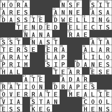 ACROSS 1. Israeli folk dance 5. Overdraft (abbr.) 8. Be seated 11. Ancient Greek god of war 12. Queen of England 1702-14 13. White ___ sheet 14. Small ungulate mammals of Africa 17. Home 19. Looked after 21. Chooses 22. Nanny 23. Actress Charlotte 24. Fast jet (abbr.) 27. Political cartoonist Thomas 29. _ moment's notice (2 wds.) 32. Laconic 34. Epoch 36. Having or resembling wings 37. Like ___ of sunshine 38. Pet locale 39. _ and Stitch 40. Demure 41. Small drink 42. Natives or inhabitants of Denmark 43. Actor Linden 44. Lacerate 46. Compass dir. 47. Had dinner 50. The sixth month of the Jewish calendar 52. Food allowance for one day 55. Window treatments 57. Make much ado about nothing 59. Ear of corn 62. By way of 63. Comedian Laurel of Laurel & Hardy 64. Calm and collected 65. Curvy letter 66. Cask 67. Coop moms DOWN 1. Possessed 2. Mouth or opening 3. Respite 4. NE Netherlands city 5. Compass dir. 6. Scornful expression 7. Chap (slang) 8. Ketch in the Levant 9. Is not 10. Labels 12. Increase 15. Empty; void 16. Pulitzer Prize-winning author Ferber 18. Area sheltered from the wind 20. Artist's stands 24. Staphylococcus 25. Father Junipero _ 26. Drop behind 28. Distinguishing feature 29. Place in a line 30. Lies 31. Came up 33. Symbol (abbr.) 35. Seem 36. Chicken ___ king 42. Window treatment 45. First of billions? 47. Atmosphere 48. Cod relative 49. Related on the mother's side 51. Arrive at 52. Be footloose 53. Opinion 54. Afternoon social gatherings 55. Lair 56. A type of plum 58. Label 60. Electrically charged atom 61. Raised railways