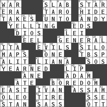 ACROSS 1. Armed conflict 4. Broad, flat, thick piece 8. Play the lead 12. Epoch 13. Edible starchy tuberous root 14. Flintstone garb 15. Proceeds 18. To (old English) 19. Actor Griffith 20. Crying or shouting loudly 22. Begley and Asner 23. "Vaya con ____" 24. Flowery wreath 25. Snakelike fish 26. Commissioned military rank 30. Call ___ day 33. Vices 36. Grain storage tower 37. Atlas contents 39. Single 40. Cook's measure (abbr.) 41. Set down 42. Climbing, woody, usually tropical vines 44. Mayday 45. Felt deep pity or tenderness 47. Mouth edge 50. A saturated hydrocarbon 51. First of billions? 53. Had dinner 54. Mood resulting from idleness 57. 90 degrees 59. "Terrible" tsar 61. Indian state 63. Butter sub 64. Become fatigued 65. Compass dir. 66. Comedian Laurel of Laurel & Hardy 67. Backtalk 68. Baseball player Mel DOWN 1. Dripping 2. Like ___ of sunshine 3. Moved through 4. Surprise greatly 5. Austrian-born American filmmaker Fritz 6. Nonscientific branch of learning 7. Sometimes accompanies a hiss 8. Most dubious of character or honesty 9. Metal containers 10. Increase 11. Marina Del _, California 16. Writer Wiesel 17. A type of plum 21. Small island 22. Car or cant ending 24. French article 26. Small, secluded valley 27. Teases 28. In addition 29. Chops off 30. "If ____ say so..." 31. Lie 32. Capital of Western Samoa 34. Null 35. _ tizzy (2 wds.) 38. Ski resort town in Vermont 42. Area sheltered from the wind 43. Having or resembling wings 46. Compass dir. 48. The content of cognition 49. Groovy apts. 52. With motion or animation 53. Toward the sea 54. Soap units 55. Washington bills 56. Vertical spar for supporting sails 57. Greek goddess of the dawn 58. The first octave above the treble staff 59. ___ a Wonderful Life 60. By way of 62. Was introduced to