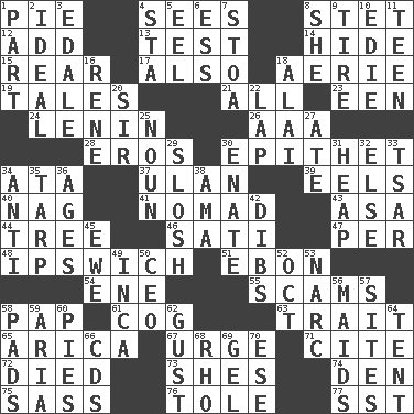 ACROSS 1. Sliced dessert 4. Observes 8. Proofreading order 12. Find the sum of 13. Trial 14. Flintstone garb 15. Posterior 17. In addition 18. Nest on high 19. Stories 21. Everything 23. Car or cant ending 24. Soviet premier 1918-24 26. American Automobile Association (abbr.) 28. Greek god of love 30. Curse 34. "One Day ___ Time" 37. Uhlan (variant) 39. Snakelike fish 40. Tired old horse 41. Wanderer 43. White ___ sheet 44. Woody plant 46. Suttee (variant) 47. For each 48. NE Massachusetts town 51. Inky black, to poets 54. Compass dir. 55. Fraudulent business schemes 58. Infant food 61. Gear tooth 63. Distinguishing feature 65. N. Chile seaport 67. Goad 71. Quote 72. Passed on 73. "______ My Girl" (Turtles hit) 74. Lair 75. Backtalk 76. Lacquered or enameled metalware 77. Fast jet (abbr.) DOWN 1. Piece 2. Perfect 3. Peak District village in England 4. R.R. building 5. Snakelike fish 6. Curvy letter 7. Portico 8. A female animal or person 9. Hoop that covers a wheel 10. Singer Brickell 11. Adolescent 16. French philosopher Descartes 18. Mountain range southwest of Kyrgyzstan 20. Title for a knight 22. Infant locale 25. Part of speech 27. Had dinner 29. Make a splashing sound 30. Related on the mother's side 31. Pile 32. Otherwise 33. Russian ruler of old 34. Opposed to 35. Canvas cover 36. Matures 38. Wet nurse (var.) 42. Claim 45. She-sheep 49. South American Indian 50. Corporate head (abbr.) 52. Sep. follower 53. Drug cop 56. Women servants 57. Settings 58. Groovy apts. 59. Roberta Peters solo 60. Sliced desserts 62. Abrupt rush of wind 64. Portable shelter 66. Music discs 68. 17th letter of the Greek alphabet 69. Set 70. Compass dir.
