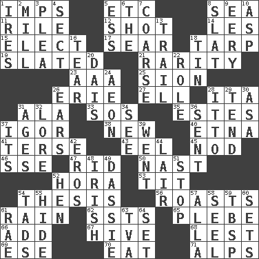 ACROSS 1. Naughty children 5. And so on (abbr.) 8. Ocean 11. Cause heat under the collar 12. Opportunity 14. French article 15. Opt 17. Burn superficially 18. Canvas cover 19. Scheduled 21. Noteworthy scarcity 23. Auto club (abbr.) 25. The Jewish people; Israel 26. One of the Great Lakes 27. Pipe bend 28. Call ___ day 31. According to 33. Mayday 35. _____ Park, CO 37. Russian composer Stravinsky 38. ___ Haven, CT 40. Inactive volcano in Sicily 41. Laconic 43. Snakelike fish 45. Allow head to fall sleepily 46. Compass dir. 47. To free from 50. Political cartoonist Thomas 52. Israeli folk dance 53. Teat (slang) 54. College paper 56. Ridicules or criticizes harshly 61. Water falling in drops from the sky 62. Fast planes 65. Military trainee 66. Say or write further 67. Hub of activity 68. For fear that 69. Compass dir. 70. Ingest 71. High mountains DOWN 1. Angers 2. Place where flour is made 3. Entreaty 4. Religious group 5. Double-curved letter 6. Definite Article 7. Unrefined 8. Narrow board 9. Suggestive of the supernatural 10. Cleo's killer 13. Lag or linger behind 16. Separate forcefully 18. Shallow baking pan 20. Raised platform 22. Hero or heavy, e.g. 24. Period of immesurable duration 26. Hearing organs 28. "Tell ____ the Marines!" 29. Be inclined (to) 30. White ___ sheet 31. Eons 32. Old wives' tales, e.g. 34. Perceive with the eye 36. Transmitted 37. ___ a Wonderful Life 39. Gone 42. Greek god of love 44. Den 48. From or relating to Ireland 49. Small ungulate mammals of Africa 51. Constrict 52. Layer 54. Small amounts or degrees 55. Flintstone garb 57. Silent film actress Nazimova 58. Stitch closed the eyes of (a falcon) 59. Cook's measure (abbr.) 60. Puts into a specified state 61. Actress Charlotte 63. Federal power corp. 64. Arrange properly for use