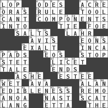 ACROSS 1. Trim (branches) 4. Lyric poems 8. Land measure 12. Mouths or openings 14. Governing power 15. Instrument 16. Patter 17. Parts 20. To the inside or interior of 21. Standoff 22. Enemy 23. Table seasonings 27. Cowardly lion portrayer 29. Opinion 31. Immeasurably long periods of time 34. Honor 35. South American Indian 36. Groovy apts. 39. Greek goddess of the dawn 41. Constrict 42. Proofreading order 43. It is permitted: Lat. 46. Lie 47. Extremities 48. American tennis player Robert 51. First name in cosmetics 54. Soggy 56. Actress Gardner 58. Actor Alda or Thicke 61. The property of being fit to eat 66. San ____ (Riviera town) 67. Small Philippine buffalo 68. Political cartoonist Thomas 69. Scram! 70. Long (Scottish) 71. Singer James 72. Definite Article DOWN 1. Venues 2. Northwest Algerian city 3. Leg coverings 4. The grampus (Milton) 5. Superhero pair 6. Shade tree 7. Back-to-school mo. 8. Had dinner 9. Meet 10. Printing process, for short 11. Otherwise 13. Portico 18. Lubricate 19. Teachers' org. 24. Not strict 25. Federal power corp. 26. Drop; flow; fall 28. Robbery 30. Fur scarf 32. Non-commissioned officer (abbr.) 33. Plant excrement 34. _____ Park, CO 36. Pacific Standard Time (abbr.) 37. "One Day ___ Time" 38. Accusation by an informer 40. Trig term 44. Music discs 45. Eastern Standard Time (abbr.) 49. Actor Linden 50. Night before a holiday 52. Hearing organs 53. Choose 54. Welt 55. Pulitzer Prize-winning author Ferber 57. Queen of England 1702-14 59. Wet nurse 60. Short letter 62. Container for groceries 63. Ingest 64. Fast jet (abbr.) 65. R.R. building