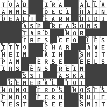 ACROSS 1. Frog relative 5. Retirement account (abbr.) 8. Silent film actress Nazimova 12. Queen of England 1702-14 13. Tenth: prefix 15. Precipitation 16. Started a card game 18. Merit 19. "You Light Up My Life" star Conn 20. Cleo's killer 22. Thinks logically 24. Edible starchy tuberous root 26. Not either 27. Angers 28. Corporate head (abbr.) 29. French article 32. "Tell ____ the Marines!" 35. Burn to charcoal 37. "___ Maria" 38. Count _ (2 wds.) 39. Direct toward a target or goal 40. Stricken, poetically 41. Baking dish 42. Celtic language 43. Snakelike fish 44. Big collection agency 45. Followers of ems 46. It's straight from the horse's mouth 49. Fast jet (abbr.) 50. "____ silly question..." 51. Commissioned military rank 55. Small child 56. Words to Nanette 57. Greek god of love 59. Olfactory organs 63. Inside; within (prefix) 64. Shade of tan 65. Governing power 66. Trial 67. Perceive with the eye 68. In a ____ (agitated or irritated) DOWN 1. Bit 2. Single 3. Santa ___, CA 4. Accusation by an informer 5. Binary compound 6. Posterior 7. Measure of real estate 8. Zeal 9. (Had) reclined 10. Flaplike coverings 11. Black tropical American cuckoo 14. More empty; more void 17. Russian ruler of old 21. Before (prefix) 23. "Barney Miller" actor Jack 25. Motion picture awards 28. Device for capturing images 29. Unable to walk 30. Morally bad or wrong 31. Arranges properly for use 32. Body of Kaffir warriors 33. Pull into pieces 34. Airtight sealed metal containers 36. Part of HMS, perhaps 40. Elected representatives 42. Main course 45. Compass dir. 47. Eastern Standard Time (abbr.) 48. Image 49. Snob 51. Went 52. Extremities 53. Arches 54. Old wives' tales, e.g. 56. Fish or hair follower 58. Institute legal proceedings 60. Player for Phoenix 61. Biblical high priest 62. Arrange properly for use