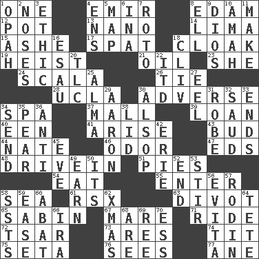 ACROSS 1. Single 4. Independent ruler or chieftain 8. Dutch treat 12. Cooking vessel 13. Billionth: prefix 14. Pale green bean 15. American tennis player Robert 17. Argument over a trivial matter 18. Cover or conceal 19. Robbery 21. Petroleum 23. A female animal or person 24. Any of the three canals of the cochlea 26. Standoff 28. Southern CA. univ. 30. Contrary to your interests or welfare 34. Health resort 37. Promenade 39. Grant temporary use of 40. Car or cant ending 41. Ascend 43. Partially opened flower 44. Nathan's nickname 46. Aroma 47. Begley and Asner 48. Popular '50s hangout 51. Sliced desserts 54. Ingest 55. Keyboard key 58. Ocean 61. Acura sports coupe 63. A piece of turf (Scot.) 65. Unit of acoustic absorption 67. Female horse 71. Travel on an animal 72. Russian ruler of old 73. Ancient Greek god of war 74. Teat (slang) 75. Bristle 76. Observes 77. A saturated hydrocarbon DOWN 1. Brightly colored fish 2. Olfactory organs 3. Value system 4. Followers of ems 5. Atlas unit 6. _ tizzy (2 wds.) 7. Printing process, for short 8. Pipe bend 9. "Vaya con ____" 10. Wet nurse 11. Create 16. He sold his birthright 18. 154 in Roman numerals 20. Affectionate concern, for short 22. It would 25. _ mater 27. Snakelike fish 29. Composer Copland 30. Columnist Joseph or Stewart 31. Loose flowing garment 32. Saudi Arabian king (1953-1964) 33. Conclusions 34. Post 35. Lightbulb-shaped fruit 36. Opposed to 38. Flaplike covering 42. One of the Great Lakes 45. Night before a holiday 49. Merit 50. It is 52. Conclusion 53. Tumult 56. Webber/Rice musical 57. "The Thinker" sculptor 58. Fast planes 59. Comfort 60. Blind as ____ 62. Dec. holiday 64. Wig 66. Lyricist Gershwin 68. "We ___ not amused" (Victoria) 69. To sift 70. Double-curved letter
