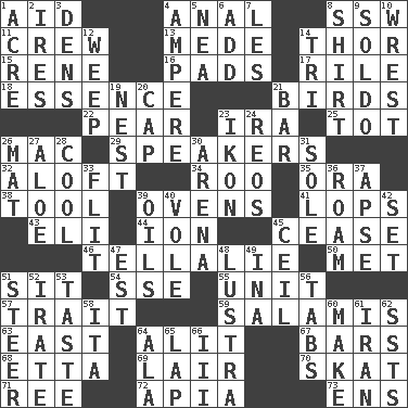 ACROSS 1. Assist 4. Of or related to the anus 8. Compass dir. 11. Ship's personnel 13. Ancient Persian 14. Son of Odin 15. French philosopher Descartes 16. Writing tablets 17. Cause heat under the collar 18. Center 21. Avian creatures 22. Lightbulb-shaped fruit 23. Lyricist Gershwin 25. Small child 26. Apple computer (short form) 29. Orators 32. Upward 34. Friend of Pooh 35. Mouth or opening 38. Utensil 39. Baking chambers 41. Chops off 43. Connecticut Ivy Leaguer 44. Electrically charged atom 45. Stop 46. Copy Pinocchio 50. Was introduced to 51. Be seated 54. Compass dir. 55. A single undivided whole 57. Distinguishing feature 59. Deli grouping 63. Compass direction 64. Came down and settled, as after flight 67. Drinking establishments 68. Singer James 69. Den 70. Three-handed card game 71. Portuguese money of account (variant) 72. Capital of Western Samoa 73. Followers of ems DOWN 1. 43,560 square feet 2. Angers 3. Cub Scout units 4. Electrical Unit 5. Teachers' org. 6. Say or write further 7. French article 8. Upper-body garment 9. Twentieth part of a lira 10. Take or capture by force 12. Shed a tear 14. Three (prefix) 19. A home for chicks 20. Head covering 21. Soap unit 23. Image 24. Vintage cars 26. Floor covering 27. Medicinal plant 28. Calm and collected 30. Sports stadium 31. Not divided or shared with others 33. Secret move to avoid paying debts 36. Wander aimlessly 37. Domed church section 39. Lubricates 40. Grand slam 42. Arrange properly for use 45. To provide with a ceiling 47. Eastern Standard Time (abbr.) 48. A period of five years 49. _ tizzy (2 wds.) 51. Navigate 52. Feeling or showing extreme anger 53. Clothes sense 56. Bar bills 58. Call ___ day 60. Cause to be 61. SW Asia republic 62. Fast planes 64. Chicken ___ king 65. Pet locale 66. One more than two