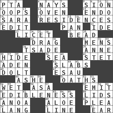 ACROSS 1. Parent Teacher Assoc. 4. Negative votes 8. The Jewish people; Israel 12. I made a mistake 14. Baking chamber 15. Inside; within (prefix) 16. "Two Mules for Sister ____" 17. Homes 20. Prepare for publication 21. Baking dish 22. Binary compound 23. It is permitted: Lat. 27. Necklace unit 29. To be drawn or hauled along 31. Not women's 34. Sadhe (variant) 35. Queen of England 1702-14 36. Flintstone garb 39. Ocean 41. Proofreading order 42. An important port of Yemen 43. Broad, flat, thick pieces 46. Stupid person 47. He sold his birthright 48. American tennis player Robert 51. Expletives 54. Soggy 56. White ___ sheet 58. Send forth 61. The property of being fit to eat 66. Hats (slang) 67. Small Philippine buffalo 68. _ vera 69. Entreaty 70. Long (Scottish) 71. Actor's bit 72. Hearing organ DOWN 1. Introduce or present, as a question 2. Frog relative 3. Showery time 4. Not either 5. "___ Maria" 6. Affirmative reply 7. Clip 8. Elected rep. 9. Event 10. Wrote a lyric poem 11. Characteristic smell of wine 13. Suttee (variant) 18. Pat or tap gently 19. Compass dir. 24. Music discs 25. Epoch 26. Bits 28. Collect or gather 30. Honkers 32. Compass dir. 33. Arrange properly for use 34. Portable shelters 36. Possessed 37. Wedding promise 38. Accusation by an informer 40. In addition 44. Auto club (abbr.) 45. Yet 49. Actor Linden 50. Compass dir. 52. Assist 53. Grin 54. Welt 55. Pulitzer Prize-winning author Ferber 57. Of or related to the anus 59. The content of cognition 60. Russian ruler of old 62. Paper or plastic container 63. Biblical high priest 64. Male child 65. Perceive with the eye
