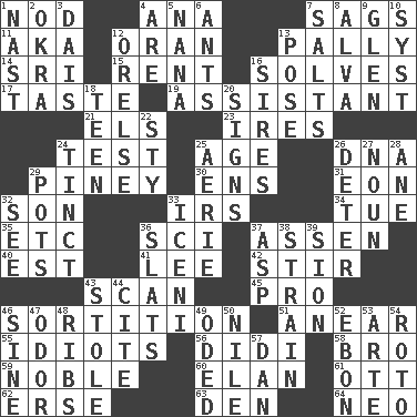 ACROSS 1. Dreamland 4. Santa ___, CA 7. Sinks 11. Alias (abbr.) 12. NW Algerian seaport 13. Friendly 14. _ Lanka 15. Monthly bill 16. Finds the solution 17. Clothes sense 19. Helper 21. Raised railways 23. Angers 24. Trial 25. Mature 26. Heredity factor (abbr.) 29. Abounding in pines 30. Followers of ems 31. A really long time 32. Male child 33. Big collection agency 34. Third day of the wk. 35. And so on (abbr.) 36. _-fi 37. NE Netherlands city 40. Eastern Standard Time (abbr.) 41. Area sheltered from the wind 42. Tumult 43. Glance over 45. Adept person 46. Determination 51. Approach 55. Foolish or stupid persons 56. "You Light Up My Life" star Conn 58. Sis' sibling 59. Having high moral qualities 60. Enthusiasm 61. Baseball player Mel 62. Celtic language 63. Lair 64. Modern: prefix DOWN 1. Political cartoonist Thomas 2. Gumbo ingredient 3. Raised platform 4. "We ___ not amused" (Victoria) 5. Nanny 6. Pismires 7. Table seasonings 8. Inventor's middle name 9. Small, secluded valley 10. System (abbr.) 12. Threatening words 13. Introduce or present, as a question 16. Male parents of animals 18. Adolescent 20. Attaches a signature 22. Filthy place 24. Tinged 25. Nest on high 26. Prevent from occurring 27. Part of speech 28. One (Scot) 29. Plant holders 32. Perceive with the eye 33. Ancient Celtic tribe of eastern Britain 36. Narrow boards 37. Viper 38. Put through a sieve 39. The Jewish people; Israel 43. Fur scarf 44. Quote 46. Trig term 47. Aroma 48. Chest bones 49. Wrote a lyric poem 50. The longest river in the world 52. Inky black, to poets 53. Johnson of "Laugh-In" 54. Printing process, for short 57. Daniel's nick name
