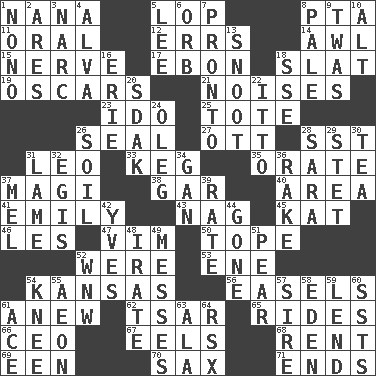 ACROSS 1. Grandmother 5. Chop off 8. Parent Teacher Association (abbr.) 11. Spoken 12. Blunders 14. Leather borer 15. Boldness 17. Inky black, to poets 18. Narrow board 19. Motion picture awards 21. Annoying sounds 23. Wedding promise 25. Lug 26. Lick closed 27. Baseball player Mel 28. Fast jet (abbr.) 31. Lion 33. Cask 35. Declaim 37. Wise men 38. Slender fish 40. Length times width 41. Poet Dickinson 43. Tired old horse 45. Krazy ___ of comics 46. French article 47. Zeal 50. Drink excessively 52. We are 53. Compass dir. 54. Sunflower state 56. Artist's stands 61. Afresh 62. Russian ruler of old 65. Amusement-park features 66. Corporate head (abbr.) 67. Snakelike fish 68. Monthly bill 69. Car or cant ending 70. Saxophone 71. Conclusions DOWN 1. Words to Nanette 2. Ancient Greek god of war 3. Drug cop 4. Inventor's middle name 5. Area sheltered from the wind 6. Globe 7. Right away 8. Diluted with white 9. It was, poetically 10. Keyboard modifier key 13. Snout, nose 16. 4th largest of the Great Lakes 18. Compass dir. 20. Neighbor of Neb. 22. "Tell ____ the Marines!" 24. Cassini of fashion 26. Earth 28. "Two Mules for Sister ____" 29. Proofreading order 30. Afternoon social gathering 31. Unable to walk 32. The front part of a cuirass 34. Separate the seeds from cotton 36. Libertine 37. Cartoonist voice _ Blanc 39. Assign a rank or rating to 42. Jacques Cousteau's middle name 44. Went 48. Feeling or showing extreme anger 49. Makes clutter 51. Lightbulb-shaped fruit 52. Compass dir. 54. Leg joint 55. Period of immesurable duration 57. Father 58. Locale of original sin 59. Grant temporary use of 60. Fast planes 61. Adept person 63. According to 64. Acura sports coupe