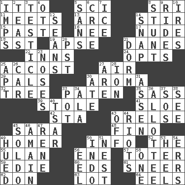 ACROSS 1. "Tell ____ the Marines!" 5. _-fi 8. Indian title of respect (Mr.) 11. Confronts 13. Curve 14. Tumult 15. Thick mixture 16. Born 17. Unadorned 18. Fast jet (abbr.) 19. Domed church section 21. Natives or inhabitants of Denmark 22. Taverns 24. Chooses 25. Buttonhole 27. Atmosphere 29. Friends 30. Odor 32. Woody plant 33. Eucharist need 35. Backtalk 39. Fur scarf 41. _ gin 42. R.R. building 43. Threatening words 45. "Two Mules for Sister ____" 48. A pale, very dry sherry 49. Simpsons dad 50. Information 52. Definite Article 55. ____ Bator, Mongolia 56. Compass dir. 57. Carrier 59. Singer Brickell 60. Begley and Asner 61. Contemptuous expression 62. Spanish title 63. Car dealer's back yard 64. Snakelike fish DOWN 1. Naughty children 2. Afternoon social gatherings 3. One of the two male reproductive glands 4. Baseball player Mel 5. Without 6. Algonquian 7. Frozen water 8. Check the growth or development of 9. Amusement-park features 10. Angers 12. Actors Connery and Penn 14. Fastener 20. Pacific Standard Time (abbr.) 21. Dormintory (informal) 23. Olfactory organs 25. Fitting 26. Automobile 27. "We ___ not amused" (Victoria) 28. Electrically charged atom 30. Had dinner 31. NE Netherlands city 33. Cooking vessel 34. Insect wing 36. One to whom something is allotted 37. Distress signal 38. Observe 40. Russian ruler of old 43. Below a satisfactory level 44. Debaucheries 45. Twentieth part of a lira 46. At full speed 47. French philosopher Descartes 49. Became colored 50. Southeast Asian peninsula 51. Egg locale 53. The bottom of a shoe or boot 54. Blunders 56. Snakelike fish 58. Single